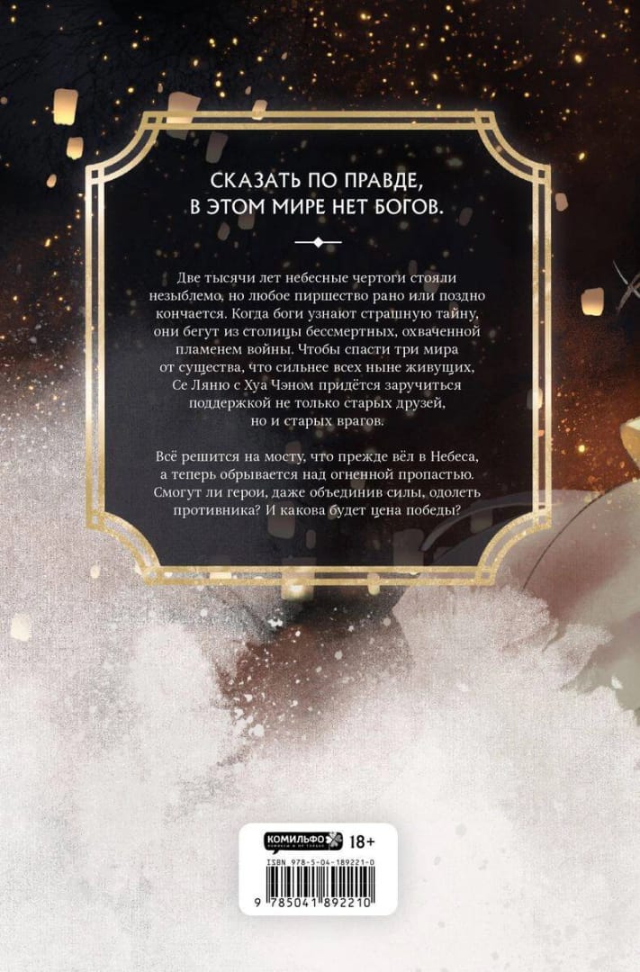 For two thousand years, the heavenly halls have stood firm, but every feast sooner or later comes to an end. When the gods learn a terrible secret, they flee the immortal capital, which is in flames of war. To save the three worlds from the creature that is more powerful than all the living, Xie Liang and Hua Cheng will have to enlist the support not only of old friends, but also of old enemies.