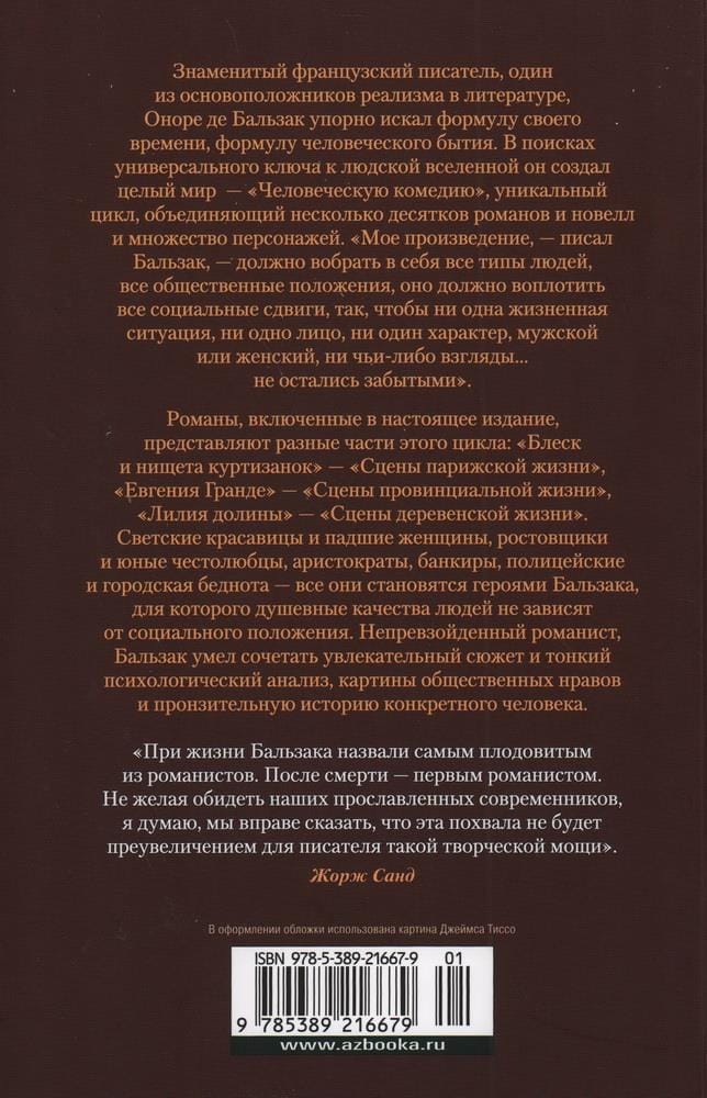Famous French writer, one of the founders of realism in literature, Honoré de Balzac persistently searched for the formula of his time, the formula of human existence. In search of a universal key to the human universe, he created a whole world - "The Human Comedy", a unique cycle that combines several dozen novels and short stories and many characters. "My work," wrote Balzac, "must absorb all types of people, all social positions, it must embody all social shifts, so that no life situation, no person, no character, male or female, no one's views ... shall not be forgotten." The novels included in this edition represent different parts of this cycle: "The Glitter and Poverty of Courtesans" - "Scenes of Parisian Life", "Eugenie Grande" - "Scenes of Provincial Life", "Lily of the Valley" - "Scenes of Village Life". Secular beauties and fallen women, moneylenders and young ambition, aristocrats, bankers, police officers and urban poor - all of them become the heroes of Balzac, for whom the mental qualities of people do not depend on social status. An unsurpassed novelist, Balzac was able to combine a fascinating plot and subtle psychological analysis, pictures of social mores and poignant history of a particular person.