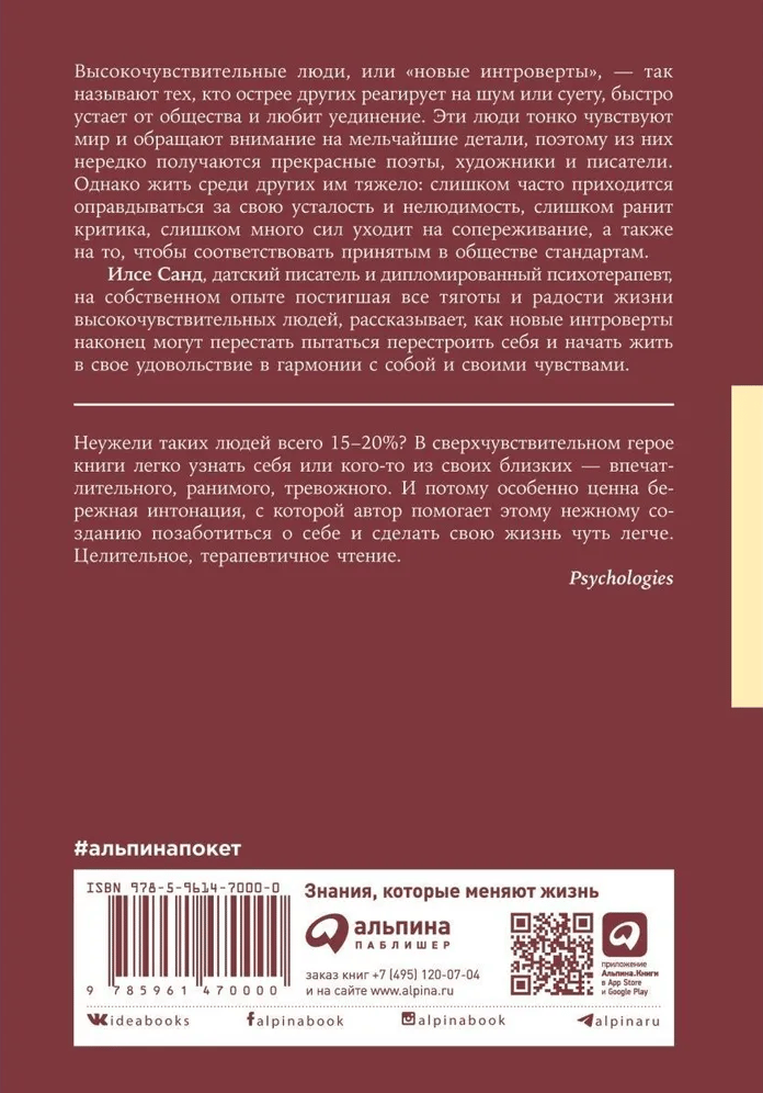 Ilse Sand, a Danish writer and certified psychotherapist, who has experienced firsthand all the hardships and joys of life for highly sensitive people, tells how new introverts can finally stop trying to rebuild themselves and start living their lives in harmony with themselves and their feelings.