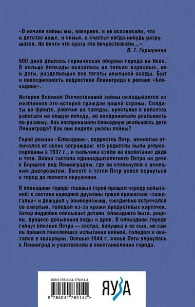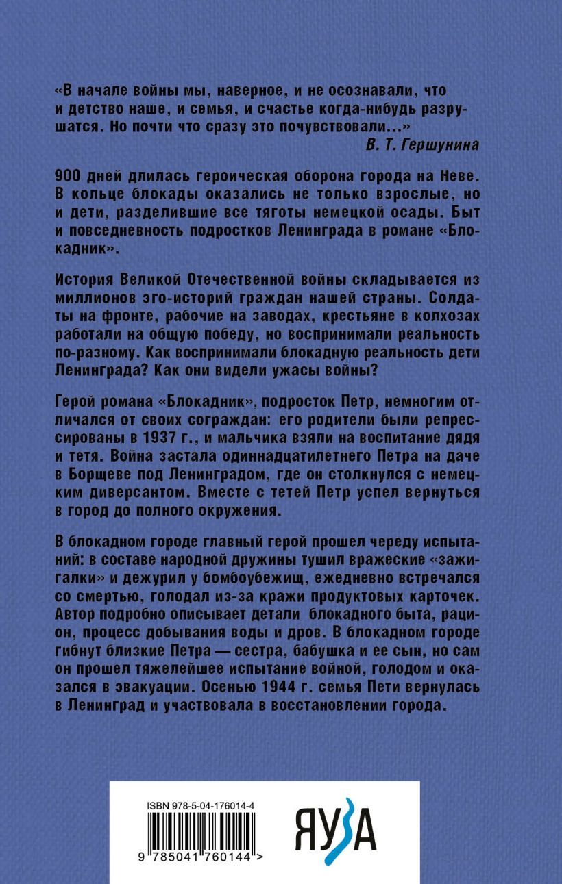 The hero of the novel "Blockadnik", the teenager Peter, was not much different from his fellow citizens - his parents were repressed in 1937, and the boy was brought up by his uncle and aunt. The war caught eleven-year-old Pyotr at a dacha in Borshchevo near Leningrad, where he encountered a German saboteur. Together with his aunt, Peter manages to return to the city before it is completely surrounded.