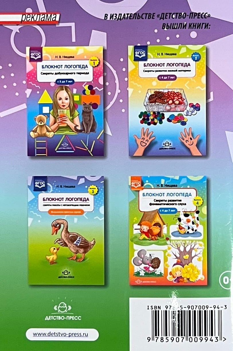 The notebook presents the second stage of corrective work with a non-speaking preschool child: elicitation of phrasal speech on the basis of simple sounds of the Russian language (sounds of early ontogenesis). At this stage the child's pronunciation of simple sounds of the Russian language is clarified, the pronunciation of words with them is practiced, and then the work on evoking phrasal speech is carried out. At this stage also begins to prepare the articulation apparatus for the production of sounds of middle and late ontogenesis. Recommended for teachers and speech therapists, teachers of ECE and children's development centers, parents of preschoolers.