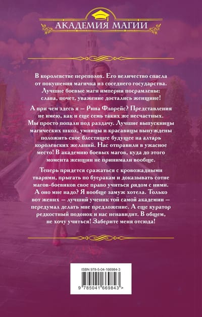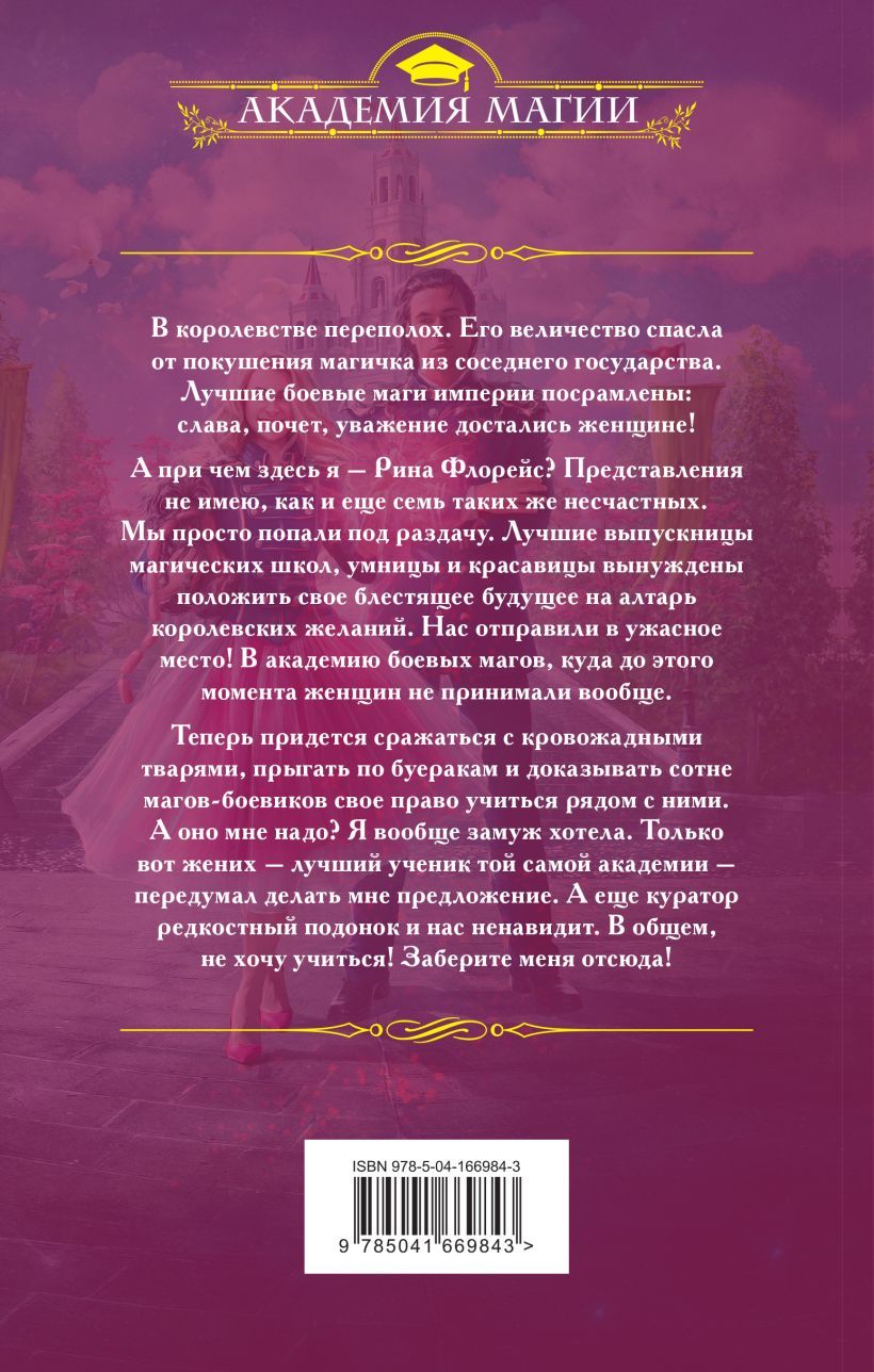 The kingdom is in turmoil. His majesty was saved from an assassination attempt by a magician from a neighboring state. The best battle mages of the empire are shamed: glory, honor, respect went to a woman! And what does this have to do with me, Rina Flores? I have no idea, and neither do seven other unfortunates like you. We're just the ones who got screwed. The finest graduates of magical schools, smart and beautiful, forced to put our bright futures on the altar of royal desires. We've been sent to a terrible place! To a martial arts academy that, until now, had never accepted women at all. Now we will have to fight bloodthirsty creatures, jump through gullies and prove to a hundred mages-martial artists their right to study next to them. What's in it for me? I wanted to get married. Except that my fiancé, the best student at that very academy, changed his mind about proposing to me. And the curator is a scumbag and hates us. So I don't want to study! Get me out of here!