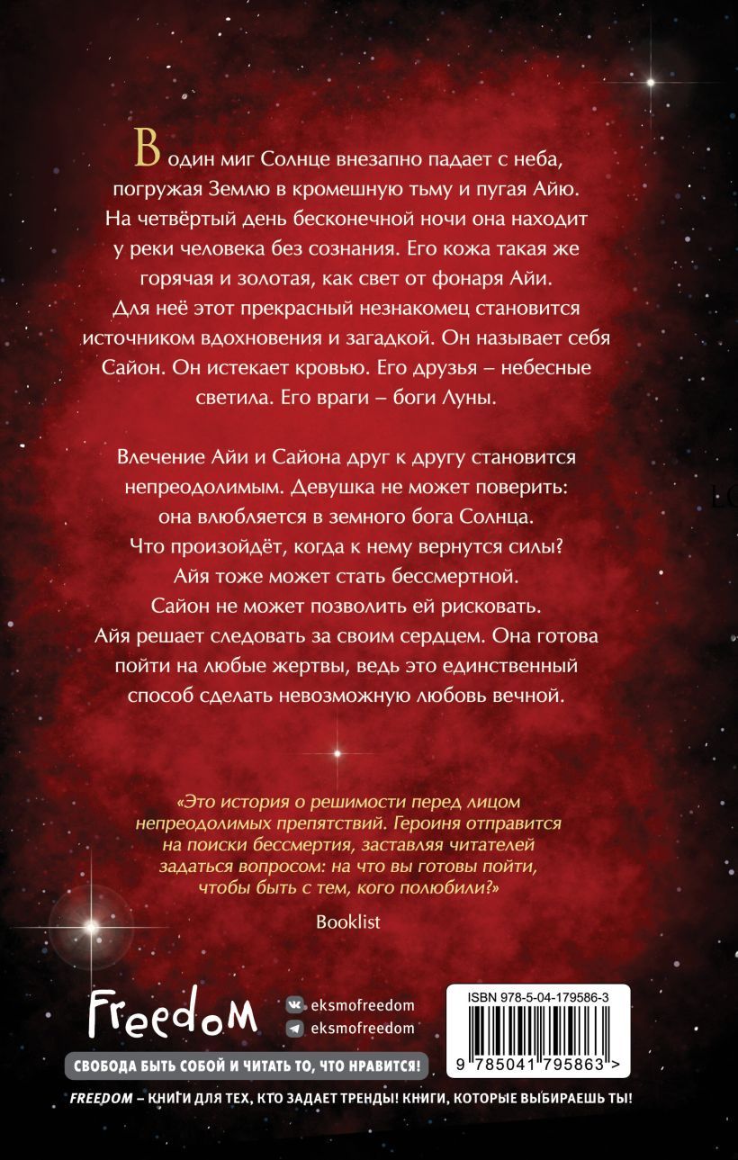 In an instant, the sun suddenly falls from the sky, plunging the Earth into pitch darkness and scaring Aya. On the fourth day of endless night, she finds a man unconscious by the river. His skin is as hot and golden as the light from Aya's lantern. For her, this beautiful stranger becomes a source of inspiration and mystery. He calls himself Syon. He's bleeding. His friends are the stars. His enemies are the moon gods.