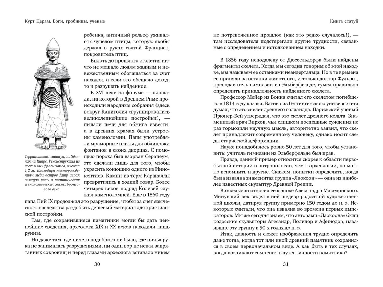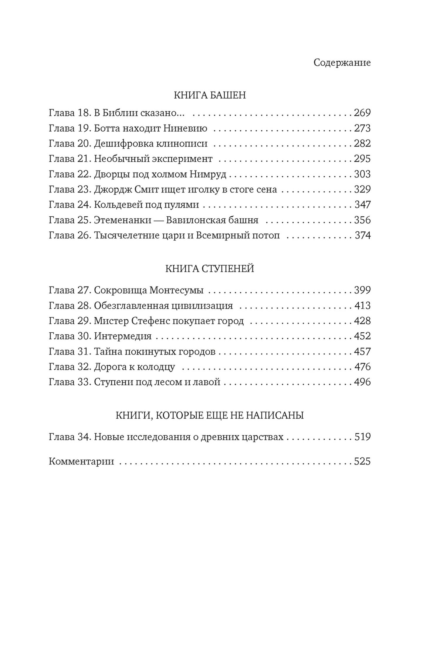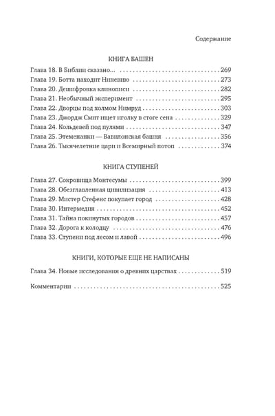 The book is divided into four parts. "The Book of Statues" tells about the birth of archaeology in connection with the excavations of Pompeii, the discovery of Troy and Mycenae, which confirmed the hypothesis of Heinrich Schliemann that Homer's "Iliad" is a reliable historical source. The following parts are devoted to revealing the secrets of the ancient civilizations of Egypt ("The Book of Pyramids"), Mesopotamia ("The Book of Towers") and Mesoamerica ("The Book of Steps").
