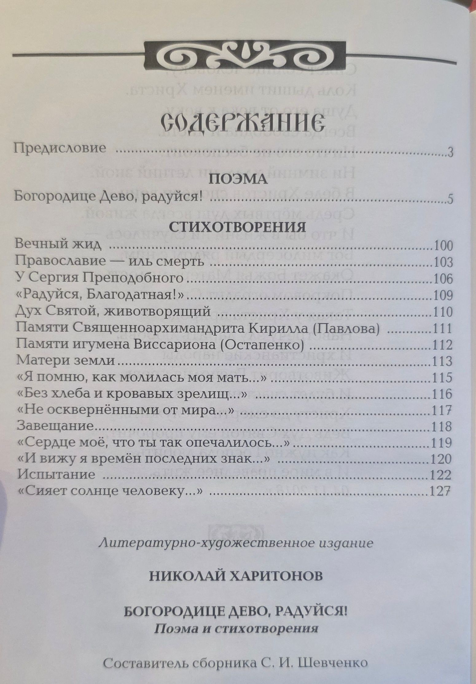The current collection, "Hail Mary!", is dedicated to the life of the Mother of God on earth. In 2011, by decision of the Academic Council of the Faculty of Orthodox Culture at the Peter the Great Military Academy of Strategic Missile Forces, Nikolai Kharitonovich was awarded the title of Honorary Professor of the Faculty of Orthodox Culture.