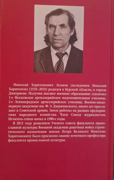 Nikolai Kharitonovich Leonov (pseudonym Nikolai Kharitonov) was born on January 20, 1935, in the town of Dmitrievo in the Kursk region. He lost his parents at a young age. He was raised with his older brother in the Skriporovsky Orphanage in the town of Maloyaroslavets in the Kaluga region. After completing his first year at the Kaluga Railway Technical School, he entered the First Moscow Artillery Preparatory School, then graduated from the Second Leningrad Artillery School and the F.E. Dzerzhinsky Military Engineering Academy. In 1965, he was demobilized from the Soviet Army for health reasons. He worked at various enterprises in the national economy. He is a member of the Union of Journalists. He began publishing poetry in the 1980s. He has published several collections: "Selected Works" (1999), "Spiritual Reflections" (2007), "Wonderful God in His Saints" (2011), and "I Want to Be Saved" (2014). All of Nikolai Kharitonov's poetry is devoted to spiritual themes. He has published the following poems: "Alexander Nevsky," "Redemption," "The Healing of Tiberius," "The Forerunner," "God the Same Yesterday, Today, and Forever," "The Shepherd," "I Want to Be Saved," "The Beautiful Bride of Christ," "The Ring of Christ," and "The First Step into Heaven (Monk)."