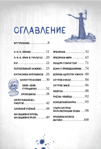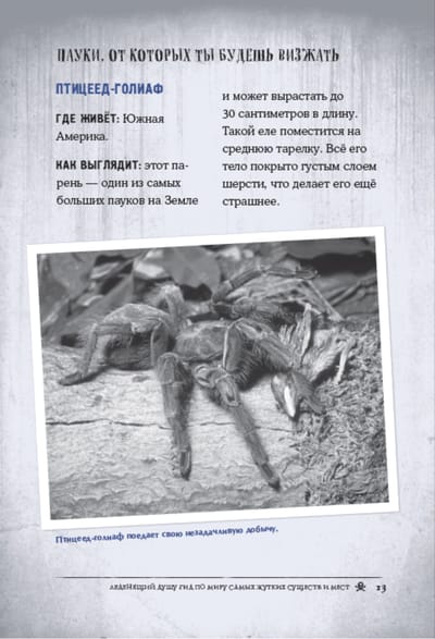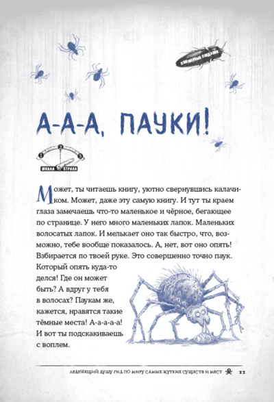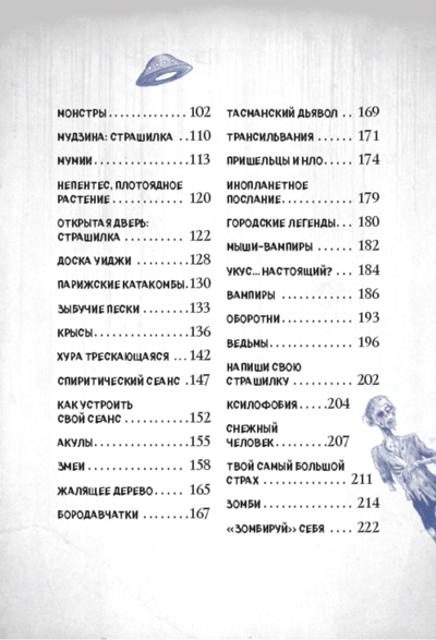 Fear! There are plenty of threats around - real and created by our imagination. What are you afraid of? I think someone's crawling through this book! Oh, and a ghostly shadow flashed in that corner... Enough said! Open "A Chilling Guide to the World's Creepiest Creatures and Places," if you're not afraid, of course! Here you will find: a sea of the most horrifying facts about the real inhabitants of our planet, as well as those who are seen only by a select few (at least, that's what they say), as well as stories about ghostly houses, nightmarish islands inhabited only by snakes or broken dolls ... And that's not all: do you like to play tricks on others? You'll find "spooky tips" to make some of your fears a little more real and entertain your friends at the same time.