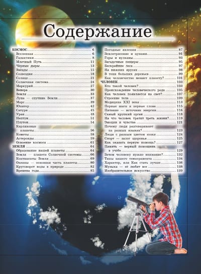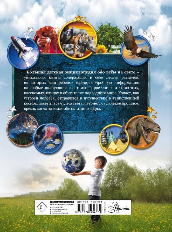 The encyclopedia contains sections on the Earth, stars and planets, earthquakes and other vicissitudes of nature. Here the child will also find useful information about plants and animals, insects, birds and inhabitants of the deep sea; learn how a person is structured and what he spends a third of his life on; he will also discover the world of ancient civilizations and extinct lizards. Our encyclopedia will not leave indifferent either children or their parents, moreover, thanks to the knowledge gained, any child will definitely become the smartest.