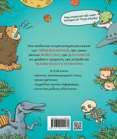 This unusual encyclopedia will become a favorite book of all young readers! After all, it tells about the secrets of the Universe, about the most diverse animals inhabiting our planet, about dinosaurs from the distant past, about the structure of the human body in ringing, memorable verses! Add to this bright pictures and detailed descriptions and explanations, and you will understand why this is the best book for the first acquaintance with our world.
