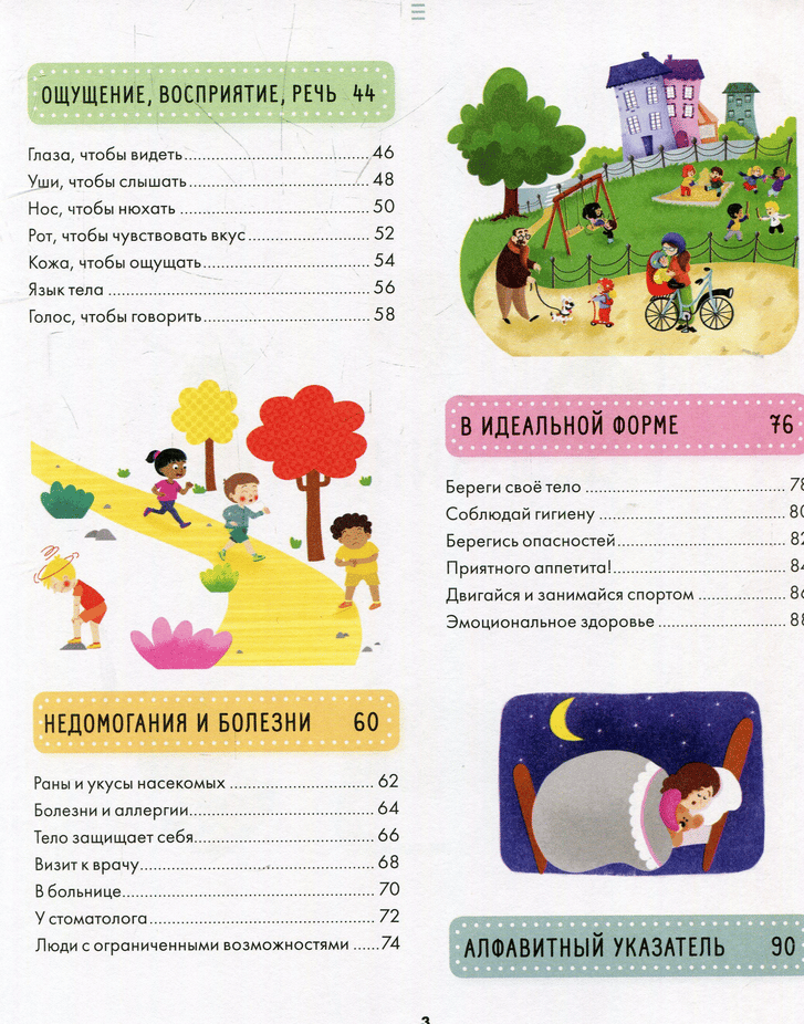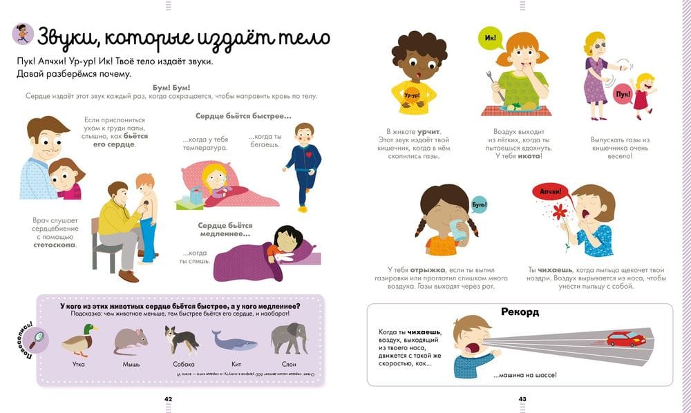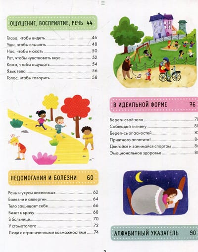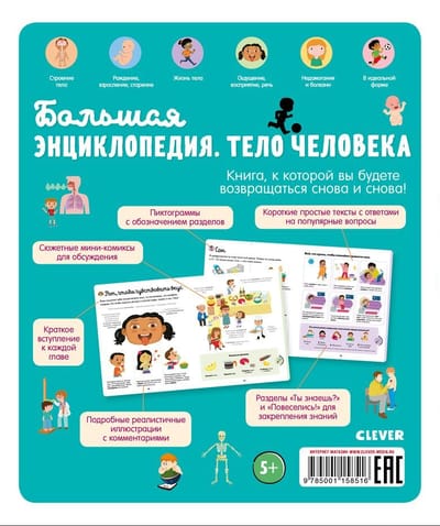 The book "The Big Encyclopedia. The human body" will reveal to your child all the secrets about the structure of the body, its functioning, birth, aging, diseases and will tell how to keep the body in shape. All the useful information is seasoned with exciting stories, interesting mini-comics and detailed realistic illustrations. What is skin like, what are hands for, what is inside the head, how do germs attack the body? What makes a 6-month-old baby different from a two-year-old? Why are people of different heights? Why do we experience anger? Why do we need to cover ourselves with a blanket before bedtime? These and many other popular children's "whys," "why's," and "how's," even those that some parents may not know the answer to, are collected in this fascinating book. Almost every spread features "Did you know?" and "Have fun!" sections that will not only entertain your child, but also help him or her playfully consolidate the knowledge gained. For ease of navigation at the end of the book "Big Encyclopedia. Human body" you will find a detailed alphabetical index.