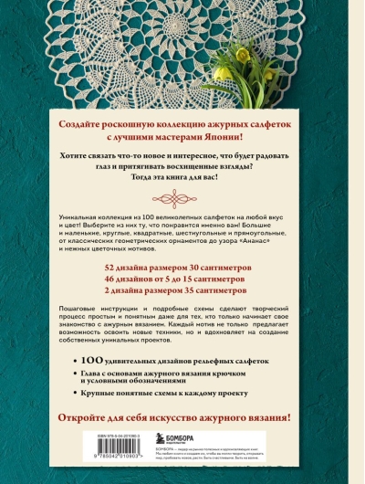 Want to knit something new and exciting that will delight the eye and attract admiring glances? Then this book is for you! Top Japanese artisans present a unique collection of 100 openwork napkins that will decorate your home or make a wonderful gift. 52 large napkins, 46 miniature ones, and 2 exclusive ones: large and small, round, square, and hexagonal, with classic patterns, a pineapple design, and floral motifs—choose the design that suits you best!