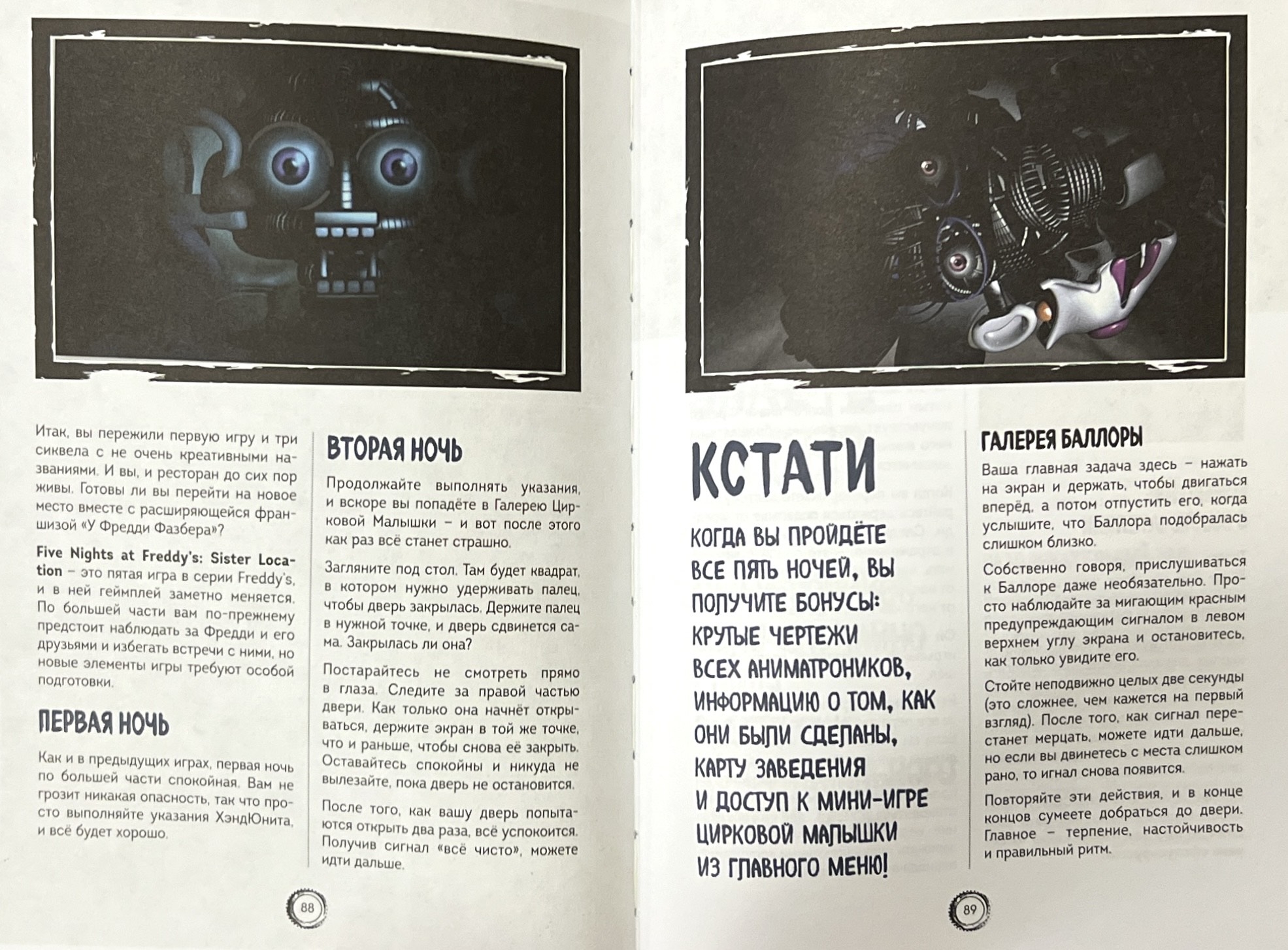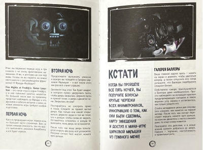 FNAF-style inside - dark, lots of black, scary in places! This book includes: walkthroughs, animatronics features, tips on how to draw characters, how to write your own scary story, examples of horror games that gamers might be interested in. How it differs from other FNAF guides: suitable for the beginner player, fan of computer games and animatronics. All in detail, in simple language, characters large. A great new addition to the Five Nights at Freddy's series book collection!