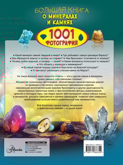 To get acquainted with the kingdom of stones and minerals that make up the solid shell of the Earth, it is not at all necessary to make long journeys and visit mineralogical museums. And in order to admire magnificent jewelry made of diamonds, rubies, sapphires and pearls, you do not even need to hold them in your hands. It is enough to open this book, which contains many unique photographs, and before you will appear majestic buildings made of marble and sandstone, elegant and luxurious stone-cut products, diamonds and other jewelry sparkling with numerous facets, man-made granite rocks and fantastic weathering figures, ancient and young mountains whose depths contain deposits of a wide variety of rocks and minerals, placers of gems and nugget deposits. Informative articles and interesting facts accompanying spectacular illustrations will allow you to learn more about the structure and properties of all these amazing riches created by nature and man. A unique collection of stones and minerals - on the pages of one book! For middle and high school age.