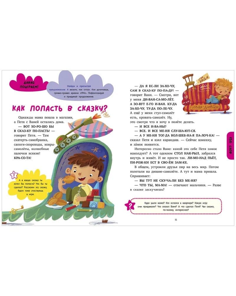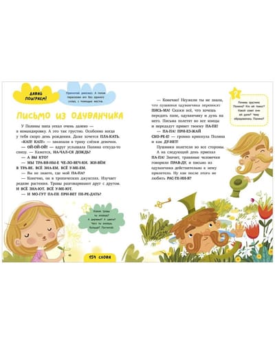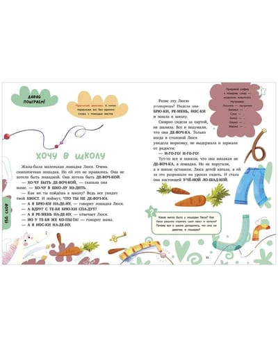 "The First Grader's Big Book of Reading" - this book of fun tales. It will help your child to love reading, because learning happens in the process of play. You won't even notice how your child will learn better reading comprehension, increase speed, improve reading technique and, importantly, be able to make up simple stories on his own. In the book you will find 45 fun stories for reading, by them the child will learn to read well by syllables, improve technique and increase reading speed, increase vocabulary before school. Several short fascinating short stories will not cause difficulties for beginning readers. Interesting plots and bright illustrations will interest the child, and additional tasks, questions and games will help adults to check how the child understood the content, develop emotional intelligence, creativity, writing skills, and help to consolidate the acquired skills. The young student will be delighted to immerse himself in the study of texts, having received the task, for example, to guess only by the highlighted words, what the story will be about. A detailed guide and instructions on how to use the book have been prepared for parents. Useful tips are sure to come in handy during the game. The effect of such reading is proven: the child will begin to recognize folds well and make words from them, will read any unfamiliar words meaningfully, will expand his horizons, will learn many new words, will learn to think creatively and analyze the text.