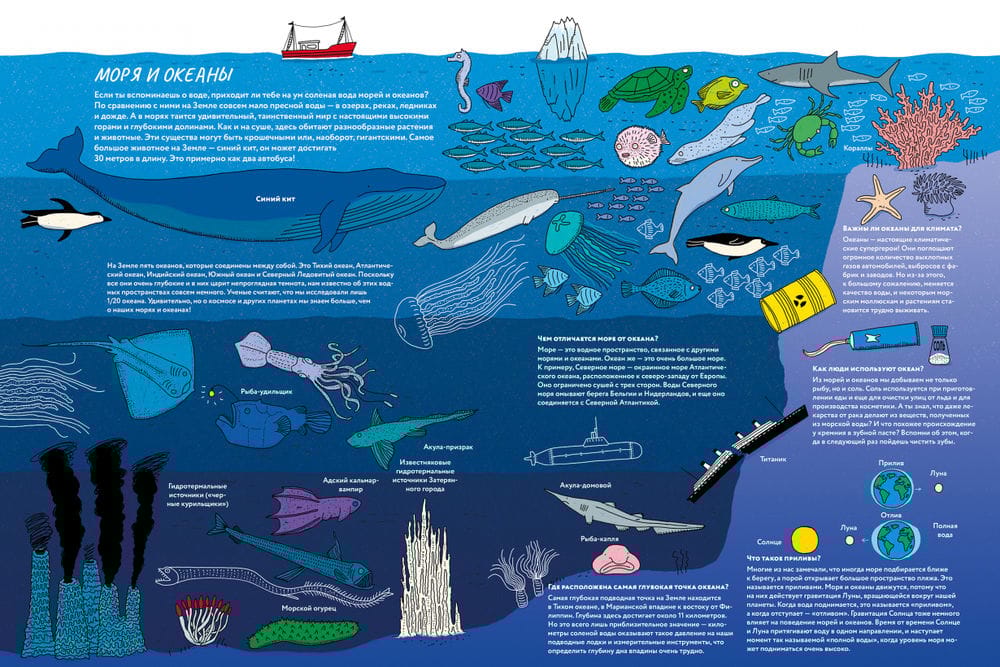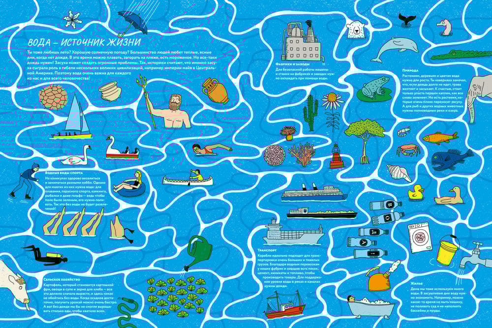 In front of you - a real informative and very modern encyclopedia, which will tell you about such an important resource for our lives as water. After all, water is not just a pond near your home, summer rain or a cup of tea that you drink in the morning. Life on our planet came from water, and now water continues to influence us, the climate, and even the course of history. That's why it's so interesting to understand the phenomena and processes associated with it! How is the sea different from the ocean? How do plants get water from the soil? Why does it rain more often in some countries than others? How does water get to your house and what happens when you flush it down the toilet? How are dams and reservoirs organized? Why do you need to drink water? These and many other interesting and important topics are covered in this book. Read, look at the brightly detailed illustrations and learn all about water. And don't forget to take care of it! And why - you will also learn from this book.