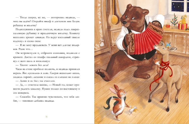 "The old bear could not believe his eyes. First came a mouse, she carried a Christmas tree decorated with balls and golden bells. She was followed by a hare with a mountain of gifts tied with ribbons, then a doe with a doormat, a squirrel with a beautiful candle, and, finally, a tit with a spruce twig in its beak flew into the den."