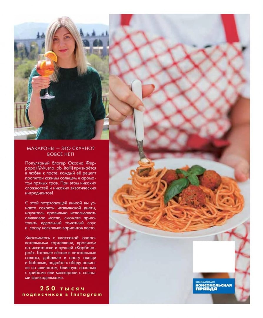 Flavorful, warm, hearty, favorite - pasta and its dishes may be different, but they will always be delicious. Popular blogger Oksana Ferrara confesses her love for pasta: each of her recipes is imbued with the southern sun and the aroma of spicy herbs. And there are no complications and no exotic ingredients! You will learn the secrets of the Italian diet, learn how to use olive oil correctly, and easily make the perfect tomato sauce and several variants of pesto. Meet the classics: charming tortellini, rabbit Ixitano, the best Carbonara and appetizing meat stew. Prepare light and nutritious salads, add pumpkin, carrot cream and even potatoes to pasta! Serve spinach ravioli, pink spaghetti, brown pasticcio, pancake lasagna with mushrooms or maccheroni with juicy meatballs.