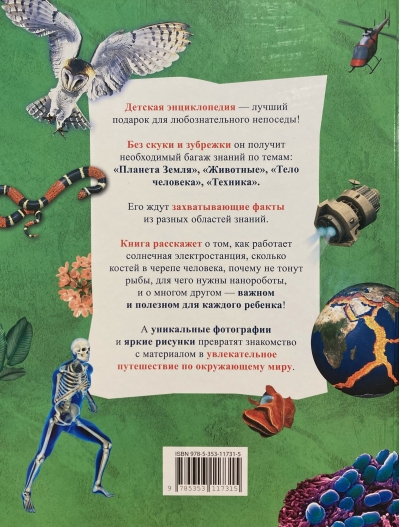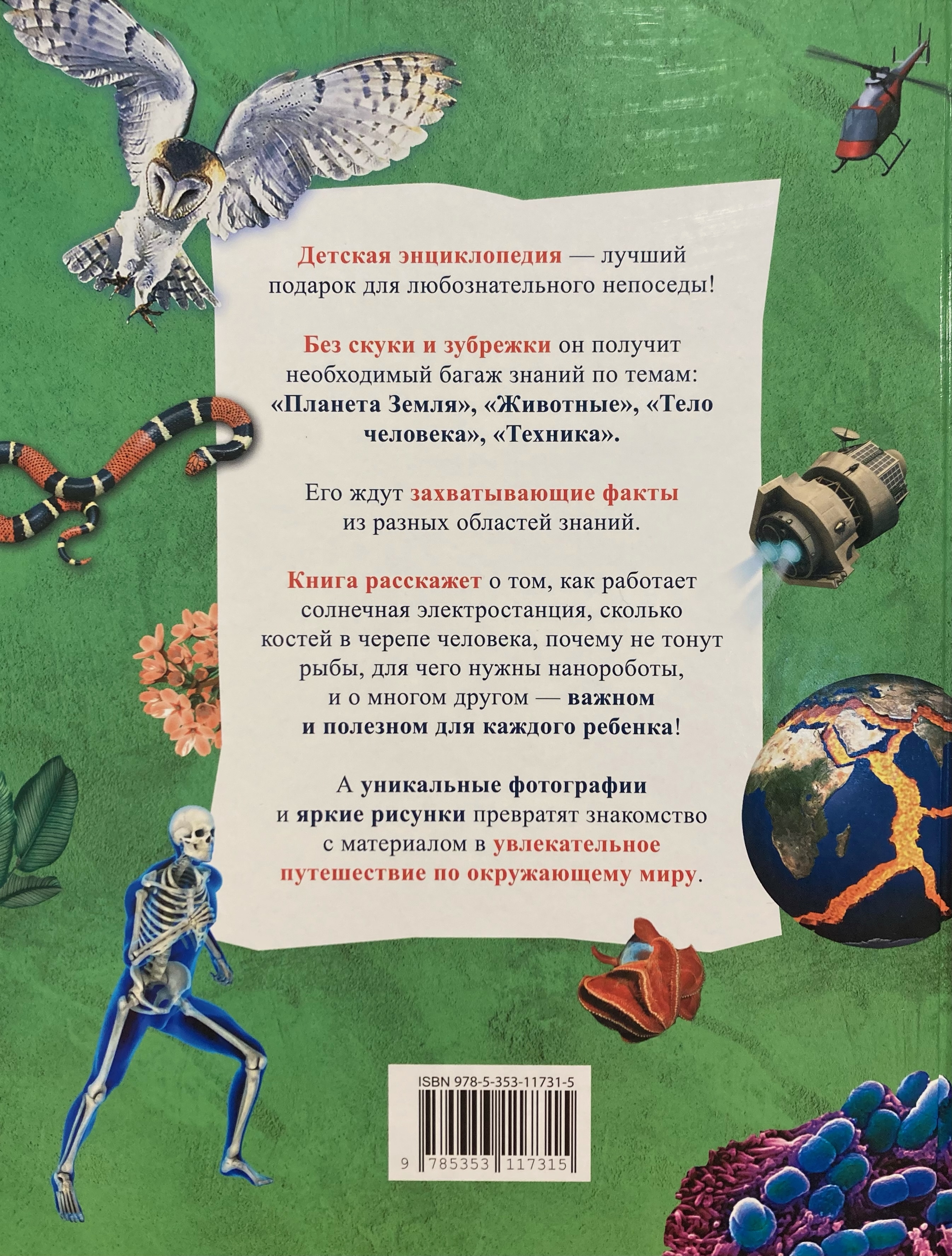 This encyclopedia is the perfect gift for an inquisitive child. How does a solar power plant work? Who lives on the ocean floor? How many bones are in the human skull? What do poisonous frogs look like? Is there a space elevator that will take you straight to orbit? This book will answer all your questions, gathering the most important and useful knowledge about our world. Unique photographs and vibrant illustrations will make reading a captivating journey!