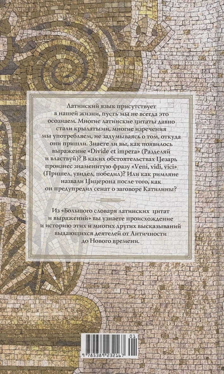 Latin, which had a special status in the ancient world, did not lose its influence after the fall of the Roman Empire. Latin remained the language of science, the official language of many states, and played an important role in international relations. It still lives on in the form of quotations and stable expressions that are widely used in European languages without translation. "The Big Dictionary of Latin Quotations" contains about 9500 Latin quotations, proverbs, sayings, mottos with an indication of their origin and pronunciation peculiarities: these are time-tested aphorisms. The edition contains sayings not only from the classical Roman period, but also later ones, which emerged in the Middle Ages and Modern times. The book will be useful for students, philologists and anyone interested in languages.