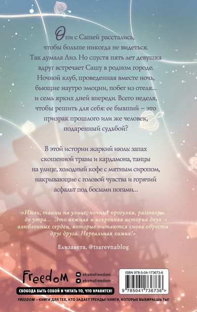 She and Sasha broke up, never to see each other again. That's what Liz thought. But five years later, the girl suddenly meets Sasha in her hometown. A nightclub, a night spent together, pounding emotions in the morning, an escape from the hotel... and seven bright days ahead. Just a week to decide for herself the most important task in life: her ex is a ghost of the past or a man given by fate? In this story, it's hot July: the smell of cut grass and cardamom, dancing in the street, cold coffee with mint syrup, feelings flooding in and hot asphalt under bare feet....