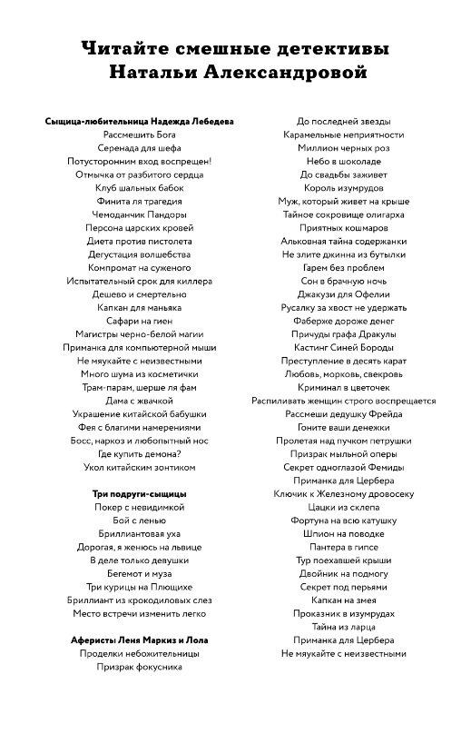 Nadezhda Lebedeva is incorrigible, and not only her husband, San Sanych, and her beloved cat, Basic, but everyone she knows thinks so. How long can she pretend to be an amateur detective and Miss Marple all rolled into one, how long can she get herself into all sorts of criminal troubles? And so it is this time: a long-awaited vacation in Karelia is over before it even begins, all because Nadya's friend dies under mysterious circumstances. And so it goes—Lebedeva takes up the investigation again...