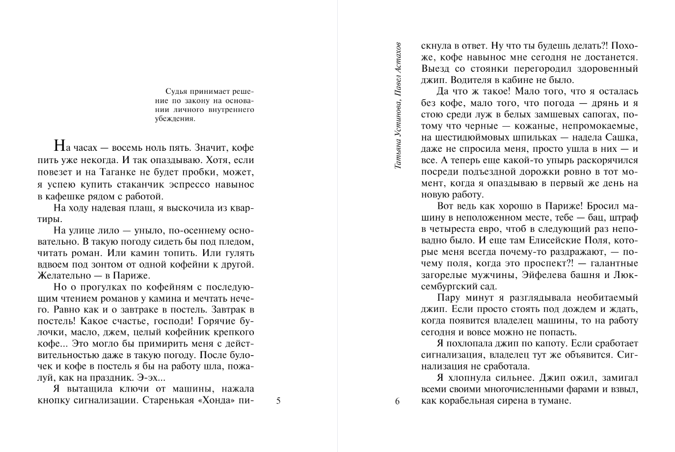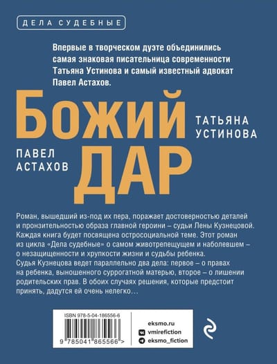 Sharp novels from the series "Judicial Affairs", written by Tatyana Ustinova and Pavel Astakhov in co-authorship, are characterized by a special dynamics and their own style: they combine the experience of lawyer Astakhov and worldly philosophy of Tatyana Ustinova, their sense of language, love of authentic details and taste for a good story. It is always a guaranteed pleasure to enjoy a good plot, dashing intrigue, authentic everyday situations, and lively and memorable characters.