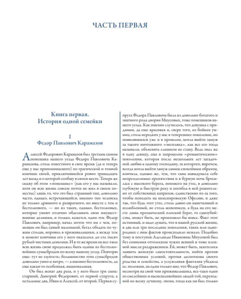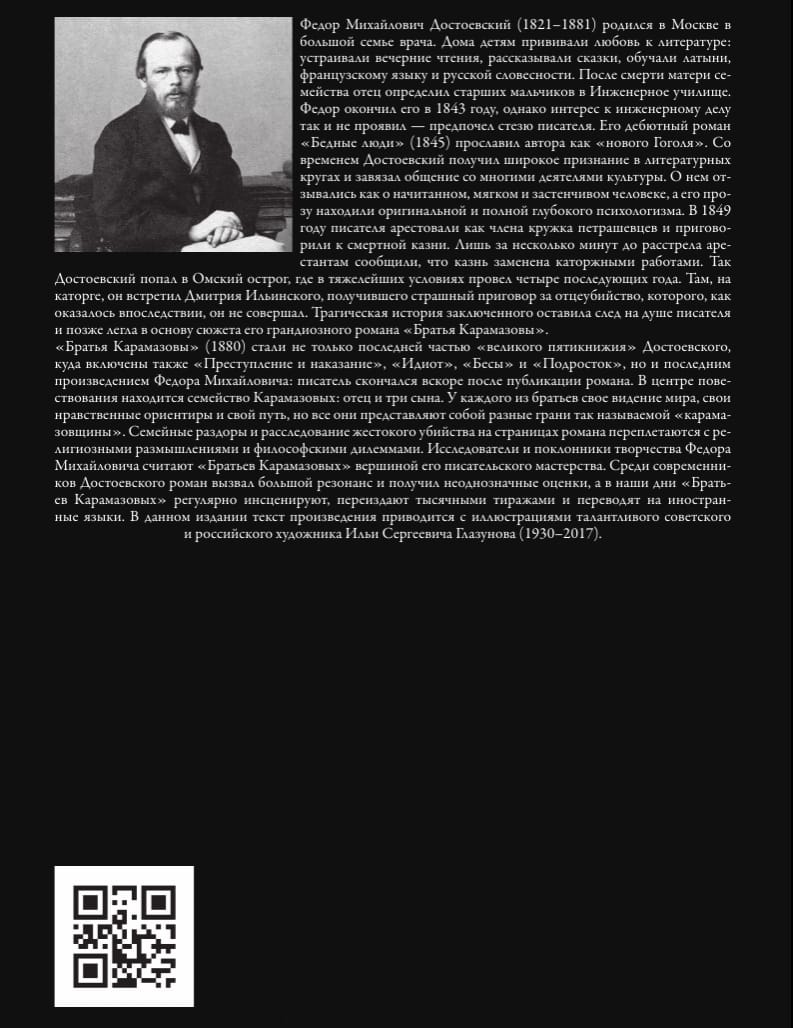 The Brothers Karamazov (1880) was not only the final installment of Dostoevsky's "great pentateuch," which also included Crime and Punishment, The Idiot, The Demons, and The Adolescent, but also Fyodor Mikhailovich's final work: the writer died shortly after the novel's publication. The narrative centers on the Karamazov family: a father and three sons. Each brother has his own worldview, moral compass, and path, but they all represent different facets of the so-called "Karamazovism." Family discord and the investigation of a brutal murder are intertwined with religious reflections and philosophical dilemmas on the novel's pages. Scholars and admirers of Fyodor Mikhailovich's work consider The Brothers Karamazov to be the pinnacle of his writing. The novel resonated with Dostoevsky's contemporaries and received mixed reviews. Today, The Brothers Karamazov is regularly staged, reprinted in thousands of copies, and translated into foreign languages.