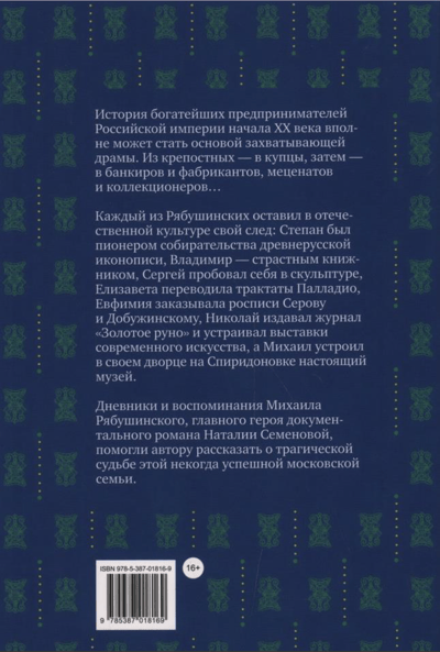 The long-awaited new book by the recognized art historian Natalia Semenova, author of the bestsellers "The Morozov Brothers. Collectors who do not bargain?", "Saga of the Shchukins. Collectors of masterpieces", "Ilya Ostroukhov. Genius dilettante", biographer and author of the first full catalogs of collections Shchukin and Morozovs The book is based on unique archival materials, diaries and family correspondence, many of which are published for the first time Fascinating narrative is illustrated with photographs and documents from the State Historical Library, the House of Russian Abroad. A. Solzhenitsyn, the New York Public Library and other archives The history of the largest entrepreneurs of the Russian Empire in the early twentieth century could be the basis of an exciting drama. From serfs to merchants, from entrepreneurs to the richest bankers and manufacturers, patrons of the arts and collectors. The Ryabushinskys combined the seemingly difficult to combine: tradition and innovation, Old Believers and interest in all things progressive. In this documentary novel, Natalia Semyonova focuses on the contribution to domestic culture of her heroes. Stepan Ryabushinsky was a pioneer collector of Old Russian iconography, Vladimir was a passionate scribe and founder of the "Icon" society, Sergei tried his hand at sculpture, his sister Liza was fond of glass work and translated Palladio's treatises from Italian, Euphemia ordered paintings for Valentin Serov and Mstislav Dobuzhinsky. Mikhail was a passionate collector of paintings and porcelain, Nicholas published the literary and art magazine "Golden Fleece" and organized exhibitions of modern art. Thanks to the memoirs and diaries of Mikhail Ryabushinsky, which he bequeathed to the New York Public Library, the author has managed to reconstruct a picture of the Ryabushinsky family's rich, happy at the turn of the epoch, but ultimately tragic fate.