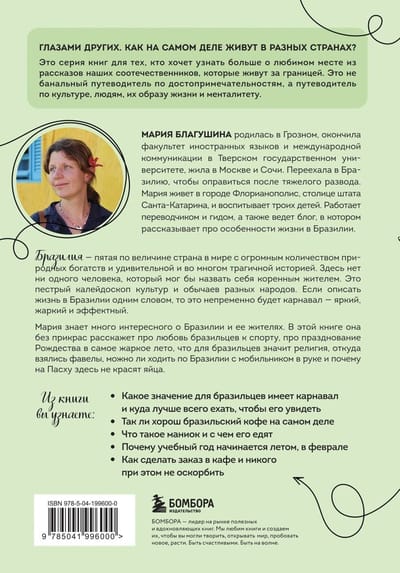 In the country of permanent carnival amazingly combines many contrasts. The author of the book Maria Blagushina lives in Brazil and knows a lot about the country and its inhabitants. In this book, she will tell you about the love of Brazilians for sports, about the celebration of Christmas in the hottest summer, what religion means to Brazilians, where the favelas came from, whether you can walk around Brazil with a mobile phone in your hand and why eggs are not painted here at Easter.