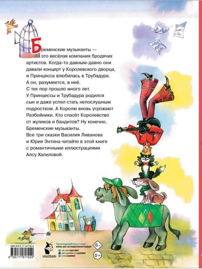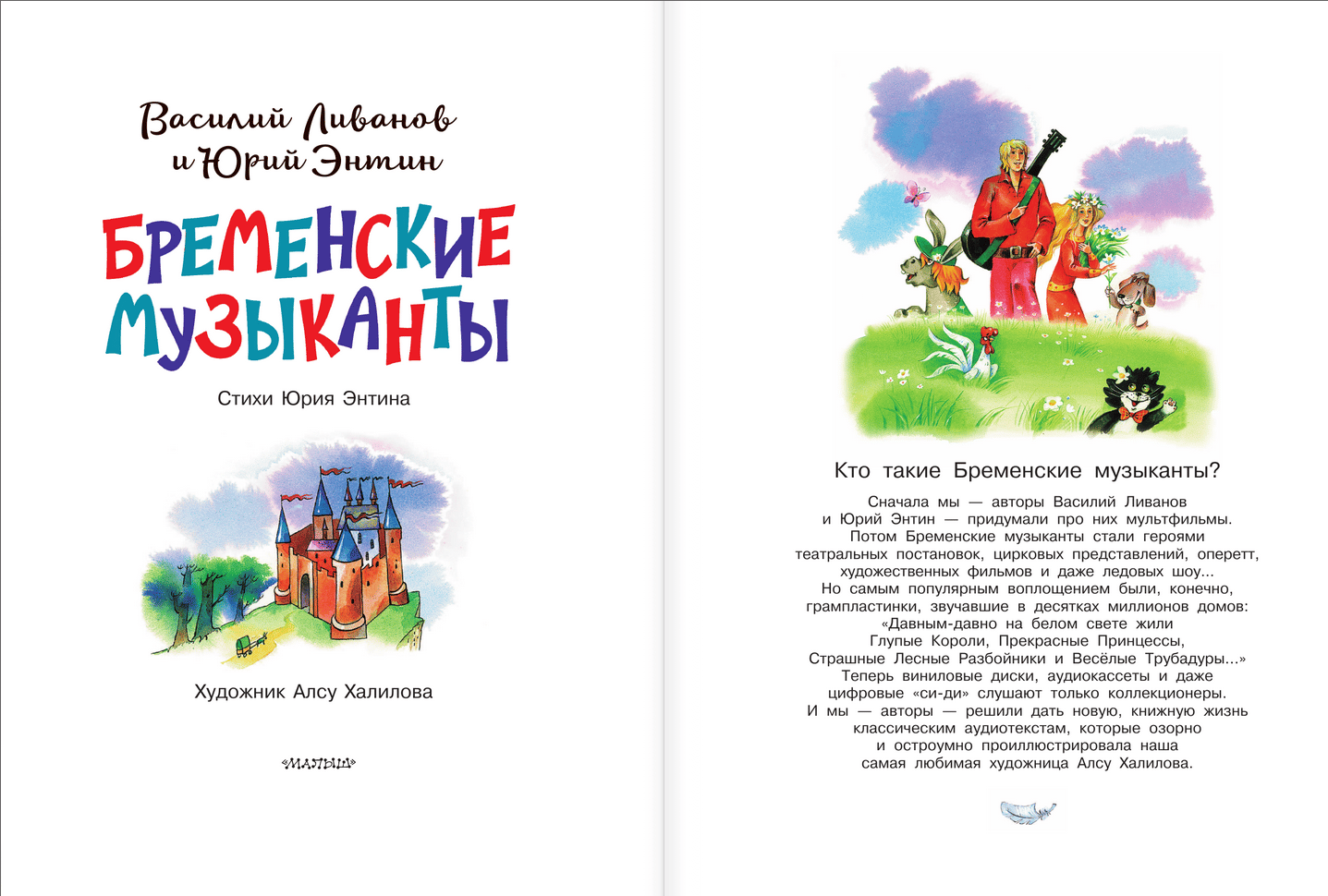sequels were written by young, talented, funny authors: Vasily Livanov and Yuri Entin, who also wrote all the poems, and music to them - composer Gennady Gladkov. In this book the reader will find all three tales of the Bremen Musicians and all the songs written for these tales. Illustrations by contemporary artist Alsu Khalilova.