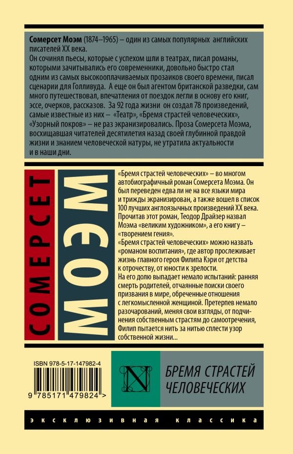 The Burden of Human Passion is a largely autobiographical novel by Somerset Maugham. It has been translated into almost every language of the world and three times screened, and was included in the list of the 100 best English-language works of the XX century. After reading this novel, Theodore Dreiser called Maugham "a great artist," and his book - "a work of genius." "The Burden of Human Passion" can be called a "novel of education", where the author traces the life of the protagonist Philip Carey from childhood to adolescence, from youth to maturity. To his share falls a lot of trials: the early death of his parents, desperate search for his vocation in the world, doomed relationship with a frivolous woman. Having suffered many disappointments, changing his views, from submission to his own passions to self-denial, Philip tries to weave the pattern of his own life thread by thread....