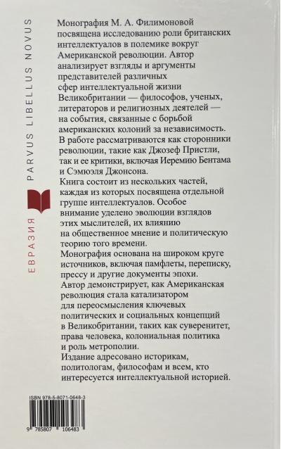 M. A. Filimonova's monograph examines the role of British intellectuals in the debate surrounding the American Revolution. The author analyzes the views and arguments of representatives from various spheres of British intellectual life—philosophers, scientists, writers, and religious figures—on the events surrounding the American colonies' struggle for independence. The work examines both supporters of the Revolution, such as Joseph Priestley, and its critics, including Jeremy Bentham and Samuel Johnson.
