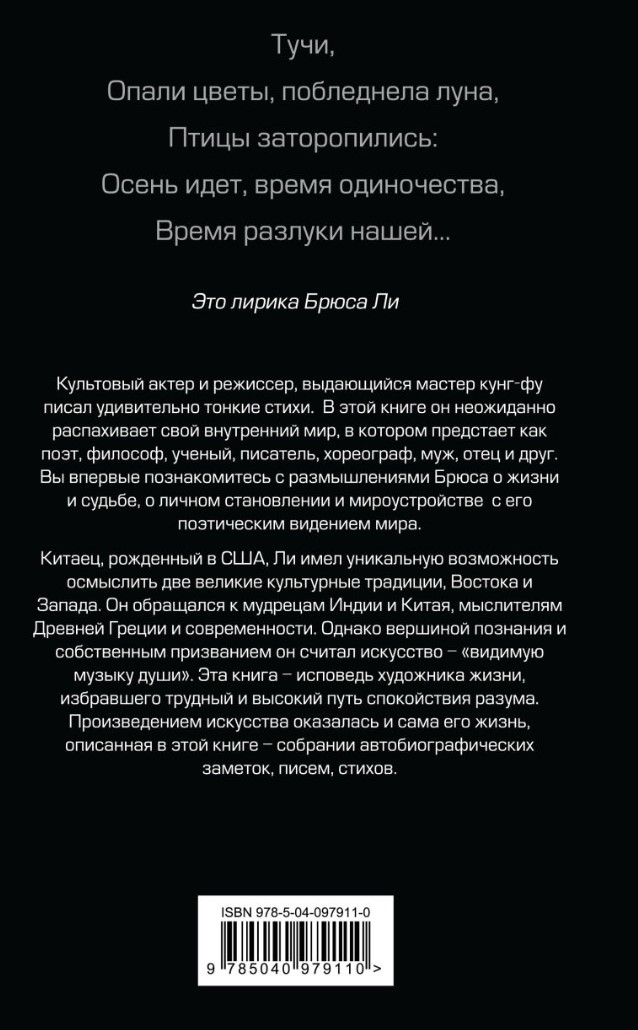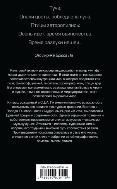His life, reflected in these memoirs—a collection of autobiographical notes, letters, essays, and poems from various years—has also become a work of art. This is the confession of an artist of life who chose the difficult path of true self-discovery. The iconic actor and director, a distinguished martial artist, reveals his inner world here, in which he emerges as a poet, philosopher, writer, husband, and father. These pages offer no eulogy for a legend, but an invitation to reflect on the balance between action and silence, body and spirit, form and freedom.