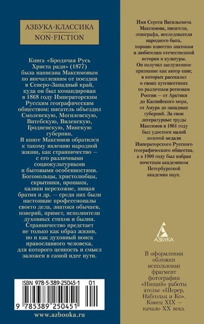 The name of Sergei Vasilyevich Maksimov, a writer, ethnographer, and researcher of folk life, is well known to connoisseurs and lovers of Russian history and culture. The book "Wandering Rus' for Christ's Sake" (1877) was written by Maksimov based on his impressions from a trip to the North-West Territory, where he was sent in 1868 by the Imperial Russian Geographical Society: the writer traveled around the Smolensk, Mogilev, Vitebsk, Vilnius, Grodno, and Minsk provinces. In the book, Maksimov addressed such a phenomenon of folk life as wandering - with its various socio-cultural and everyday features. Pilgrims, Christ-lovers, secretive people, proshaks, wandering beggars, beggarly brethren, etc. - among them were true professionals in their field, experts in customs, beliefs, omens, performers of spiritual poems and epics. Pilgrimship appears not only as a way of life, but also as a spiritual quest of an Orthodox person, for whom value and meaning are embedded in the very idea of the path.
