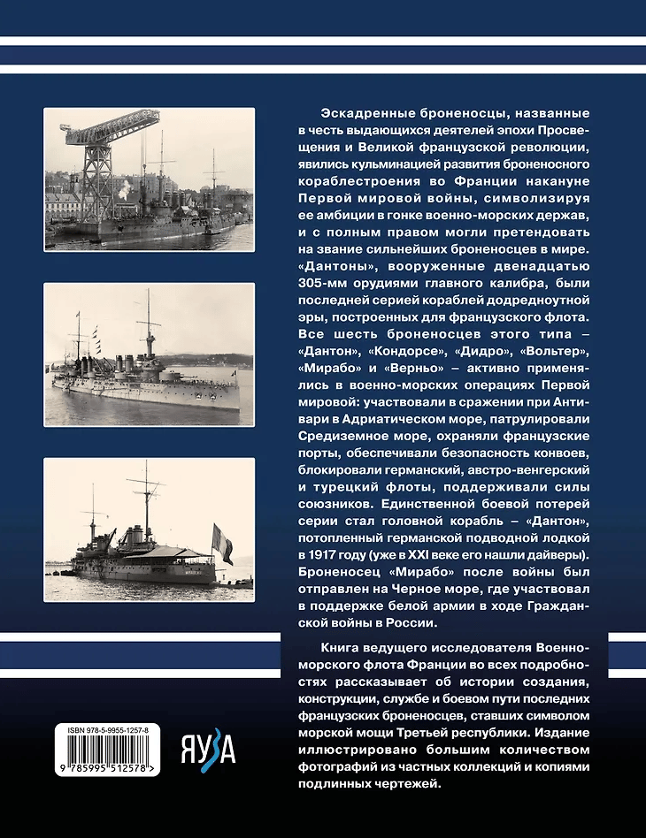 The book by the leading researcher of the French Navy tells in detail the history of the creation, design, service and combat path of the last French battleships, which became a symbol of the naval power of the Third Republic. The publication is illustrated with a large number of photographs from private collections and copies of original drawings.