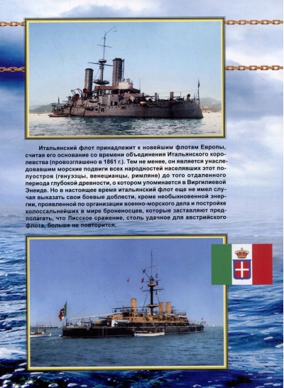 The Italian navy belongs to the newest navy in Europe, counting its foundation since the unification of the Kingdom of Italy in 1861. Nevertheless, it inherited the naval exploits of all the peoples who inhabited the peninsula, starting with the Romans. But in the middle of the XIX century, the Italian navy had not yet had the opportunity to show its fighting prowess other than by demonstrating the extraordinary energy shown in the organization of naval affairs and the construction of colossal battleships, which made us assume that a battle like that of Liss, so successful for the Austrian fleet, will not happen again.