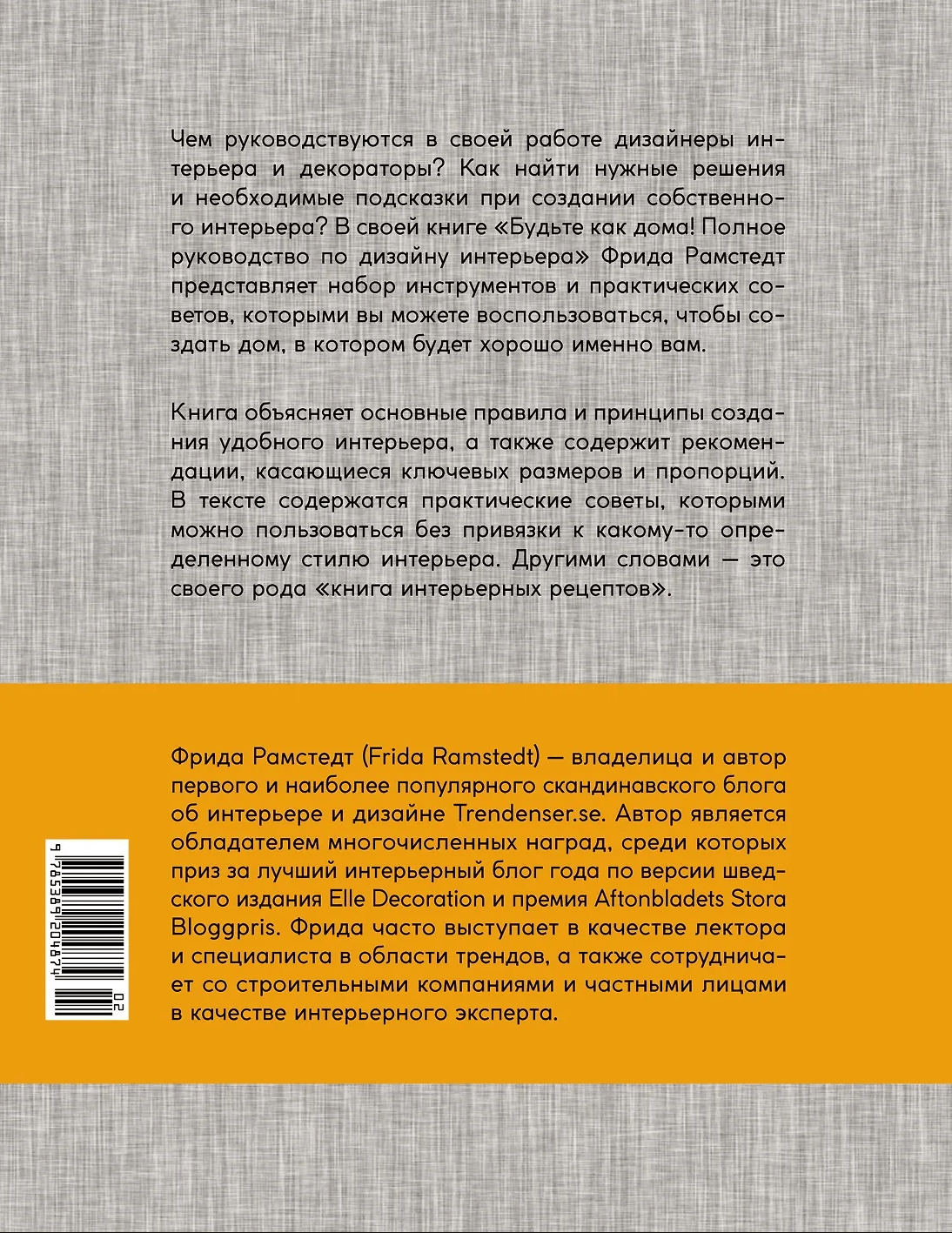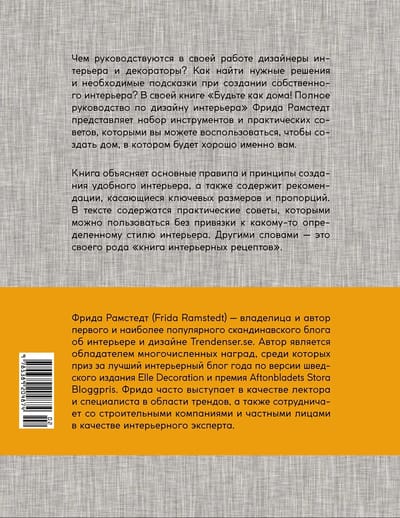 At what height should I hang a lamp over the dining table? How should I arrange the furniture in the living room? What distance should I leave between the bed and the closet? The author gives reasoned answers to all these practical questions. Practical recommendations presented in simple, understandable language are a valuable and rare thing in the world of interior design. It's all in the details. We can figure out the big questions ourselves, but it's the knowledge of the little things that distinguishes a professional from an amateur. The author of the book shares these "important little things". Publishing a book on interior design without photographs is a bold and even revolutionary decision. Our world is overflowing with inspiring pictures of cozy interiors. We would just like to know HOW to bring all this beauty to life. "The Complete Guide to Interior Design" by Frida Ramstedt provides the answer. The book is located right between colorful publications with inspiring interior pictures and dry professional literature on construction and architecture.