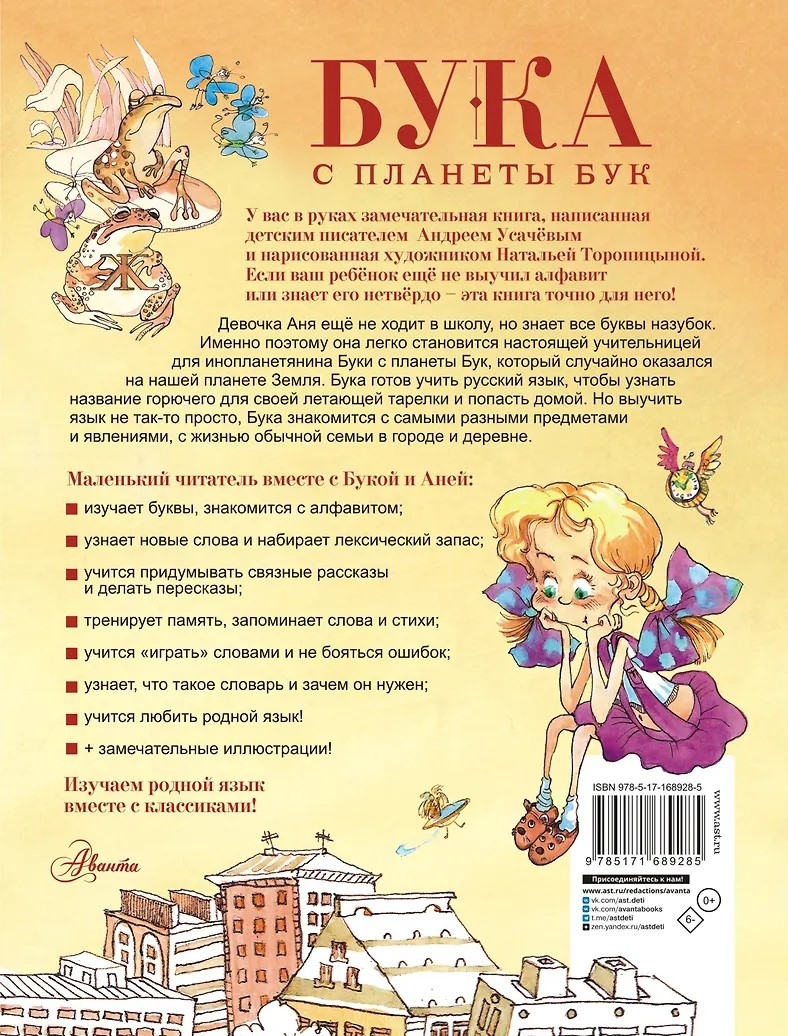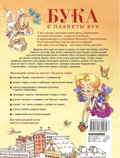 Anya isn't yet in school, but she knows all the letters by heart. That's why she easily becomes a true teacher for Buka, an alien from the planet Buka, who accidentally landed on our planet Earth. Buka is ready to learn Russian to find out the name of the fuel for his flying saucer and get home. But learning a language isn't easy; Buka encounters a wide variety of objects and phenomena, as well as the lives of ordinary families in the city and the countryside.