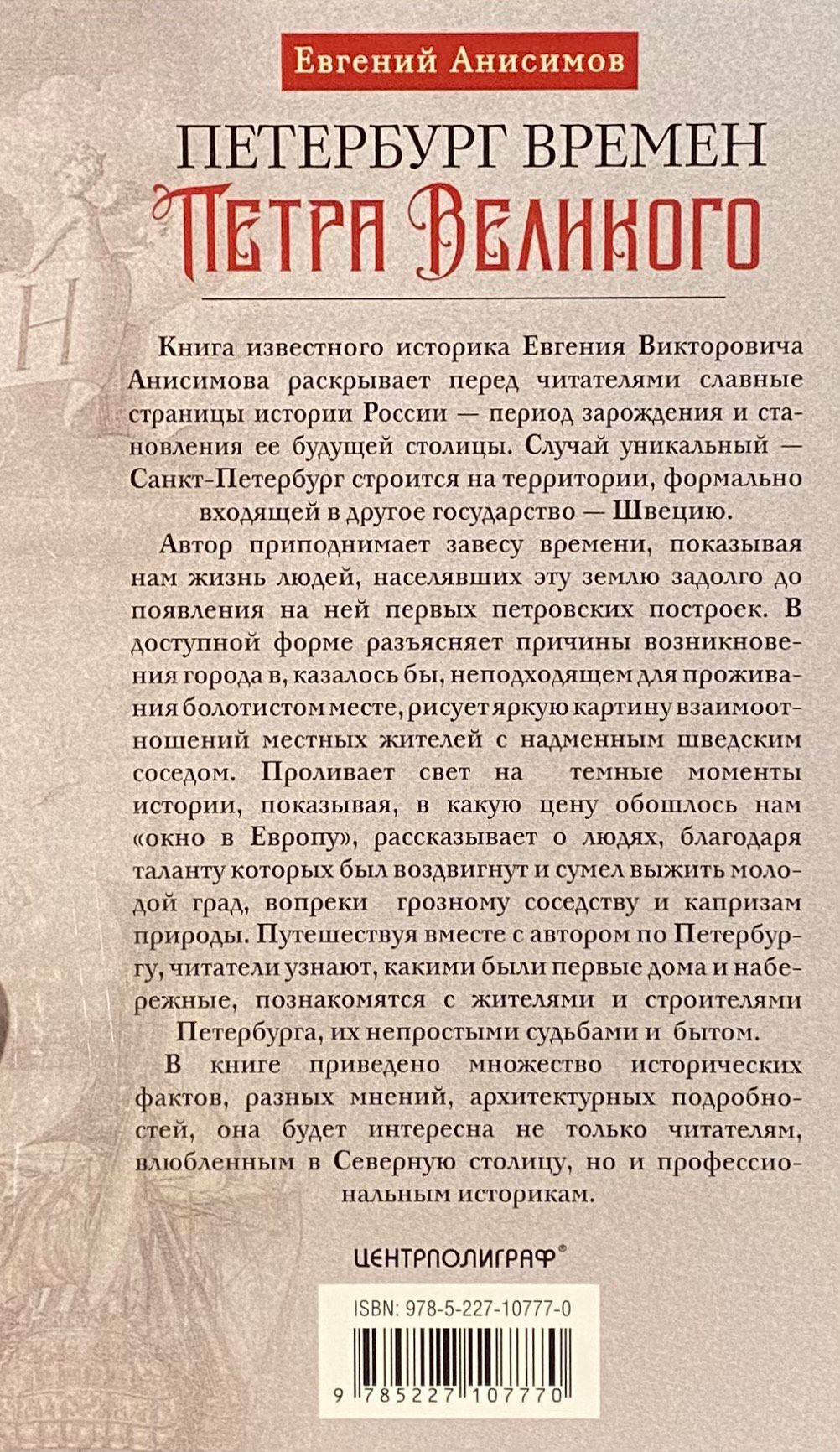 The book by the famous historian Evgeny Viktorovich Anisimov reveals to readers the glorious pages of Russian history — the period of the birth and formation of its future capital. The case is unique — St. Petersburg is being built on territory formally part of another state — Sweden. The author sheds light on the dark moments of history, showing the price that the “window to Europe” cost us, tells about the people, thanks to whose talent the young city was erected and managed to survive, despite the formidable neighborhood and the vagaries of nature. Traveling with the author around St. Petersburg, readers will learn what the first houses and embankments were like, get acquainted with the residents and builders of St. Petersburg, their difficult fates and everyday life. The book contains many historical facts, different opinions, architectural details, it will be of interest not only to readers in love with the Northern capital, but also to professional historians.