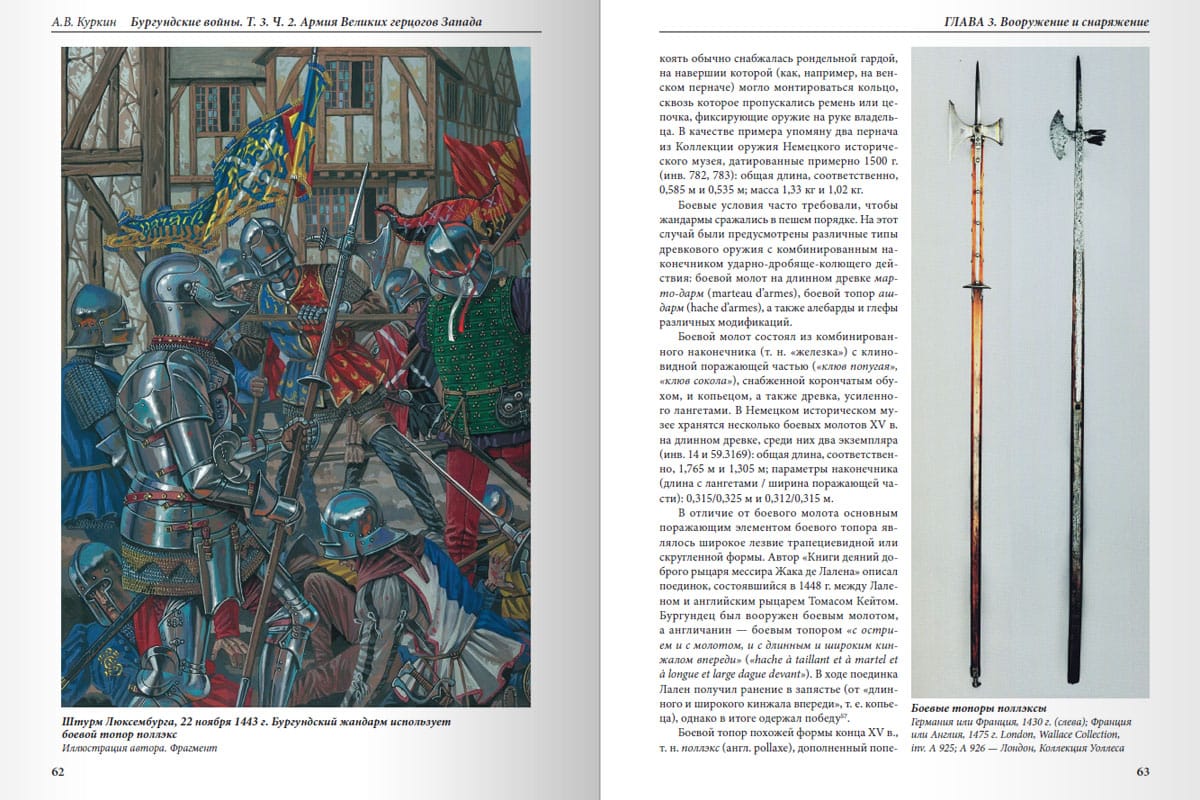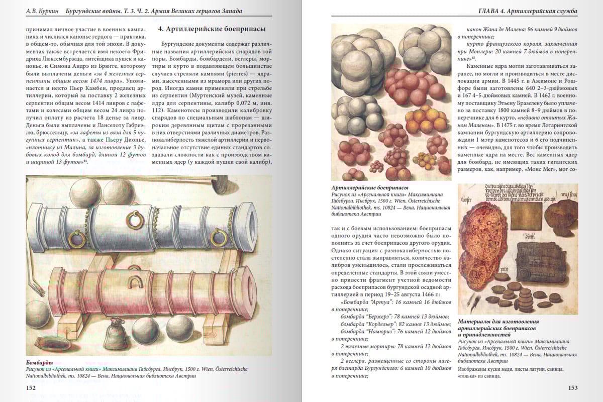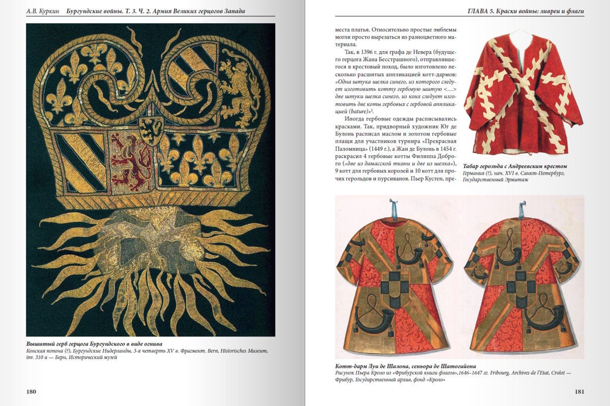 The second part of the book "The Burgundian Wars. The Army of the Grand Dukes of the West" is devoted to such aspects of the military affairs of the Burgundian state as armament, artillery and symbols placed on elements of uniforms and banners. Drawing on a vast array of sources, the author shows the reader the colorful and opulent facade of one of the strongest armies of the Late Middle Ages. Polished armor and shiny ringlets, livery embroidered with heraldic emblems, silk standards fluttering in the wind, snow-white trellises of soldiers' tents and knights' tents, advanced artillery for that time - bombards, serpentines, couleurines and wagglers! All this caused envy of European rulers and became for them both an element of constant threat and a desirable military booty. All this was made by famous Burgundian and Flemish masters - armorers-armourers, artists-decorators, embroiderers and masters of foundry, scrupulously counted, paid from the ducal treasury or the purses of wealthy lords, stored in arsenals and transported under the walls of enemy fortresses and on the battlefields. And then almost all of this formidable luxury burned in the fire of battles and sieges, decayed from time or was sent by descendants in the merciless meltdown. Therefore, the author had to do a tremendous job to bring back from oblivion at least part of the former Burgundian military splendor and present it to the reader.