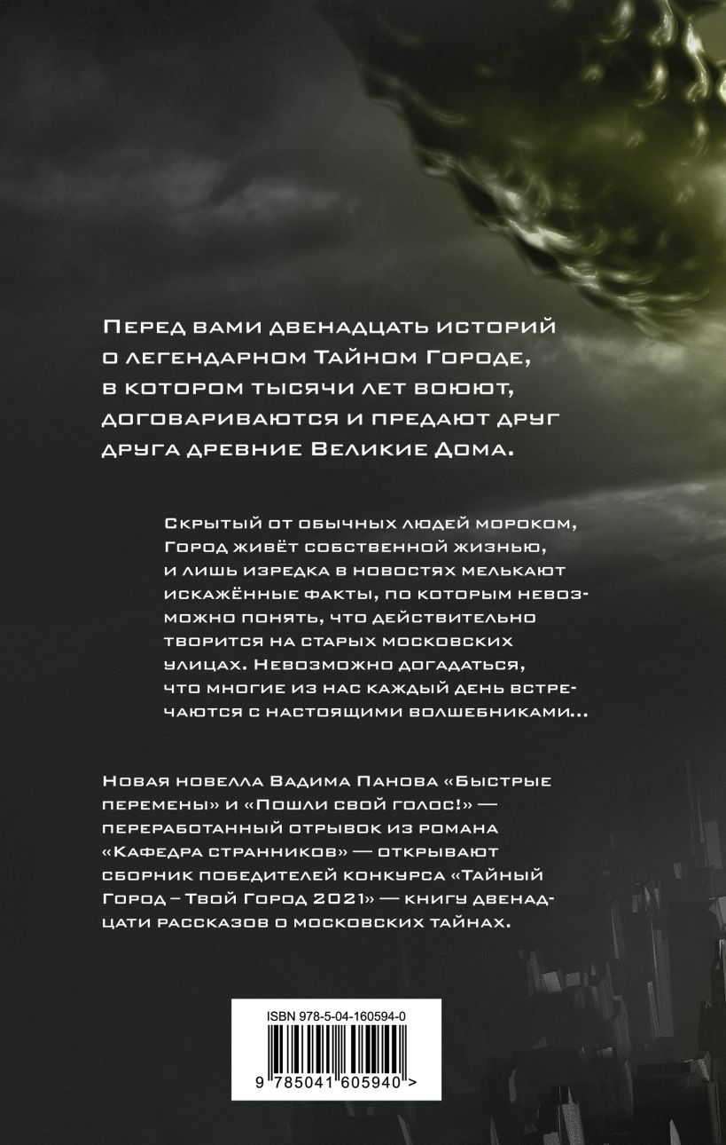 Here are twelve stories about the legendary Secret City, where ancient Great Houses have been fighting, negotiating and betraying each other for thousands of years. Hidden from ordinary people by darkness, the City lives its own life and only occasionally distorted facts flash in the news, making it impossible to understand what is really happening on the old Moscow streets. It is impossible to guess that many of us meet real wizards every day... Vadim Panov's new short story "Quick Changes" and "Send Your Voice!" - a reworked excerpt from the novel "The Department of Wanderers", open the collection of winners of the "Secret City - Your City 2021" competition - a book of twelve stories about Moscow secrets.