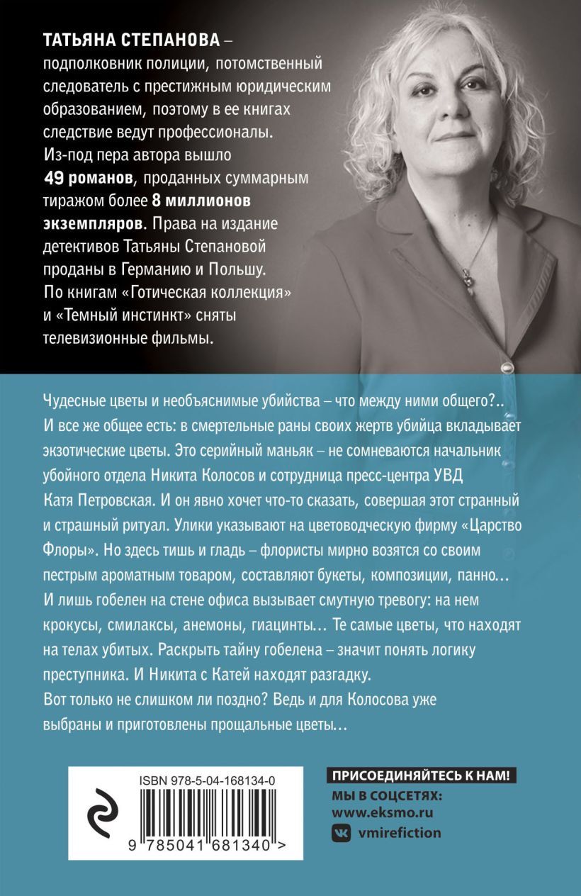 Wonderful flowers and unexplained murders - what do they have in common?...? And yet there is common: in the fatal wounds of his victims, the killer puts exotic flowers. This is a serial maniac - no doubt the head of the "homicide" department Nikita Kolosov and employee of the Press Center of the police department Katya Petrovskaya. And he clearly wants to say something, committing this strange and terrible ritual. The evidence points to the floricultural firm "Tsarstvo Flora". But here is quiet and smooth - florists peacefully fiddling with their variegated, fragrant goods, make bouquets, compositions, panels ... And only the tapestry on the wall of the office causes vague alarm: it has crocuses, smilaxes, anemones, hyacinths ... The same flowers that are found on the bodies of the murdered. To solve the mystery of the tapestry - means to understand the logic of the criminal. And Nikita and Katya find the clue. But is it not too late? After all, for Kolosov already chosen and prepared farewell flowers ...