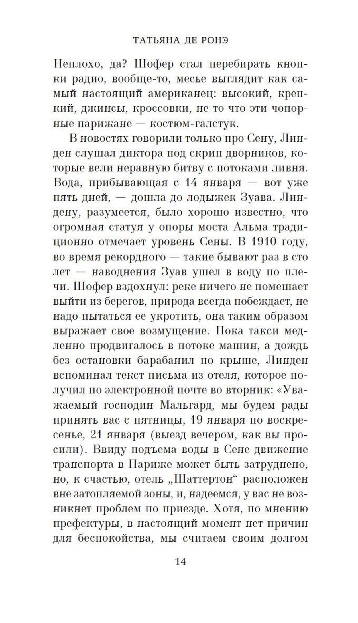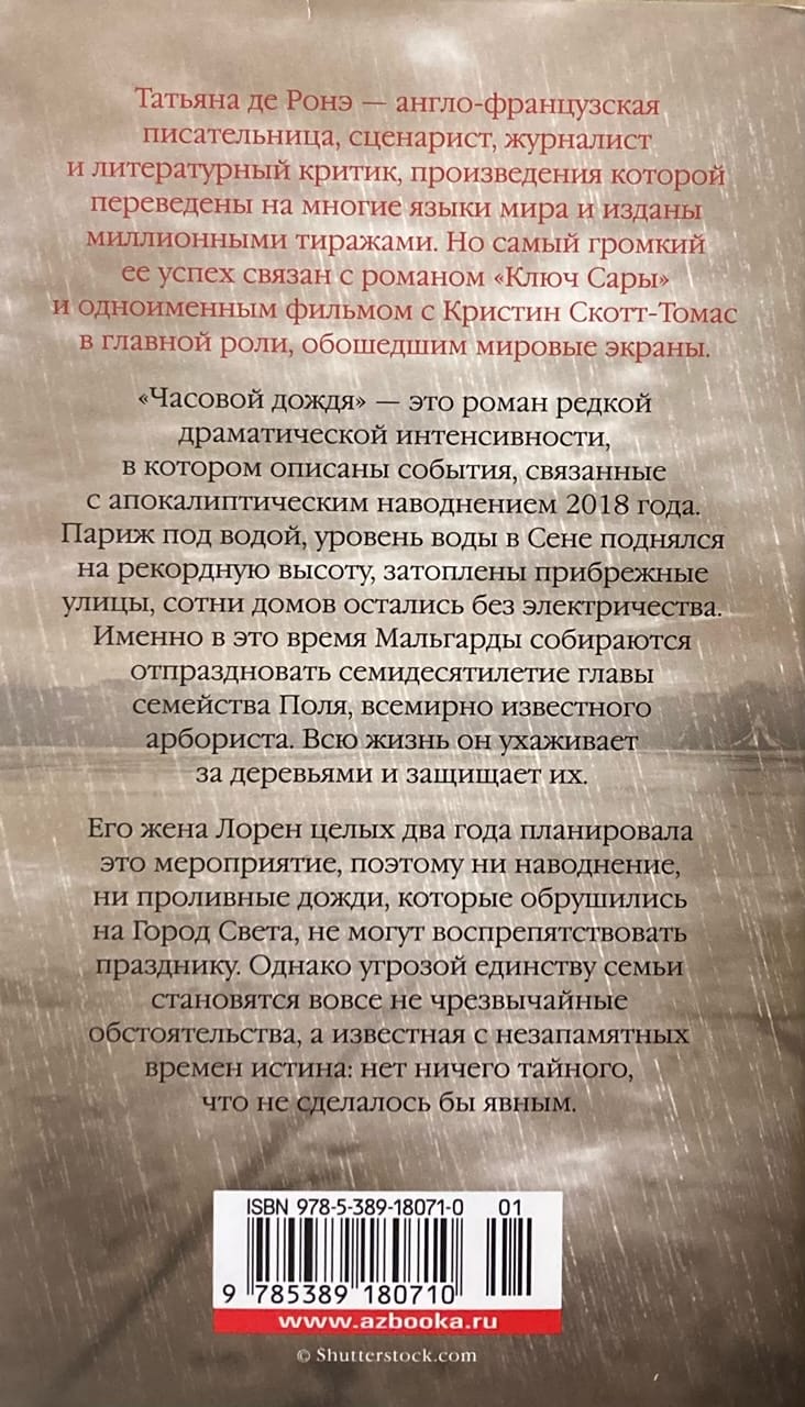 Tatiana de Ronay is an English-French writer, screenwriter, journalist and literary critic, whose works have been translated into many languages and published in millions of copies. But her most resounding success is associated with the novel "Sarah's Key" and the film of the same name with Kristin Scott-Thomas in the leading role, which has been shown around the world. "The Rain Watcher" is a novel of rare dramatic intensity, in which the psychological tension is enhanced by an apocalyptic flood. Paris is underwater, the water level in the Seine has risen to a record high, the coastal streets are flooded, hundreds of houses are left without electricity. It is at this time that the Malgards are going to celebrate the seventieth birthday of the head of the family, Paul, a world-famous arborist. All his life he has been caring for trees and protecting them. He even chose the names for his children in honor of the linden, his favorite tree. His wife Lauren has been planning this event for two years, so neither the flood nor the torrential rains that have hit the City of Light can prevent the celebration. However, it is not the extraordinary circumstances that threaten the family unity, but a truth known since time immemorial: there is nothing secret that will not become clear.