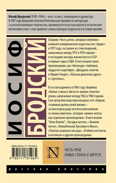 The collection "Part of Speech," first published by the American publisher Ardis in 1977, is composed of poems written between 1972 and 1976—the poet's final months in his homeland and his first years in exile.