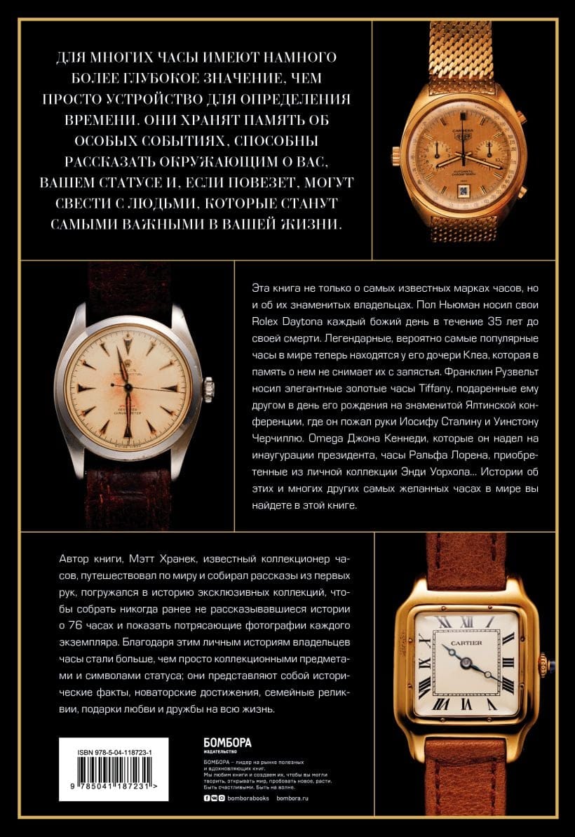 The legendary, most popular, collectible watches featured in this book are more than just devices for telling time. They preserve the memory of special events and the famous people who once wore them: Franklin Roosevelt, John F. Kennedy, Ralph Lauren, and many others whose lives and triumphs are forever imprinted on the dials of exclusive timepieces. You will immerse yourself in the history of the unique collections, read never-before-told stories about the 76 watches and see stunning photographs of each of the famous brands. Through these personal stories of the owners, the watches have become more than just collectors' items and status symbols; they are historical facts, groundbreaking achievements, family heirlooms, gifts of love and lifelong friendship.