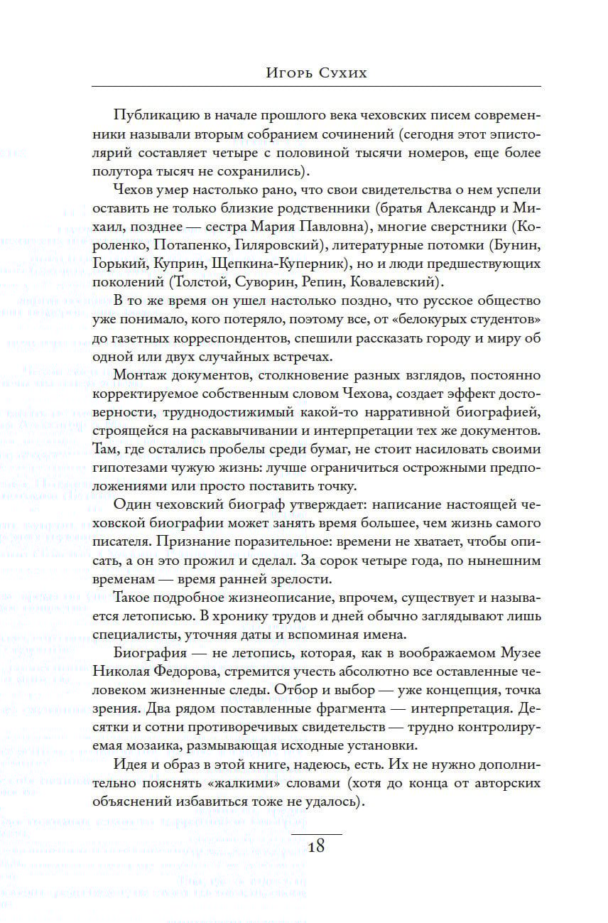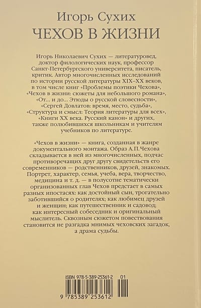 "Chekhov in Life" - a book created in the genre of documentary montage. The image of Chekhov is formed in it from numerous, sometimes contradictory testimonies of his contemporaries - relatives, friends and acquaintances. Portrait, character, family, studies, faith, creativity, medicine, etc. - In half a hundred thematically organized chapters Chekhov appears in a variety of different hypostases: as a worthy son, touchingly caring for his parents; as a favorite of friends and women; as a traveler and gardener; as an interesting conversationalist and original thinker. The cross-cutting plot of the narrative is not the unraveling of Chekhov's imaginary riddles, but the drama of fate. Igor Nikolaevich Sukhikh, a well-known literary scholar, doctor of philological sciences, professor at St. Petersburg University and one of the best researchers of Chekhov's work.