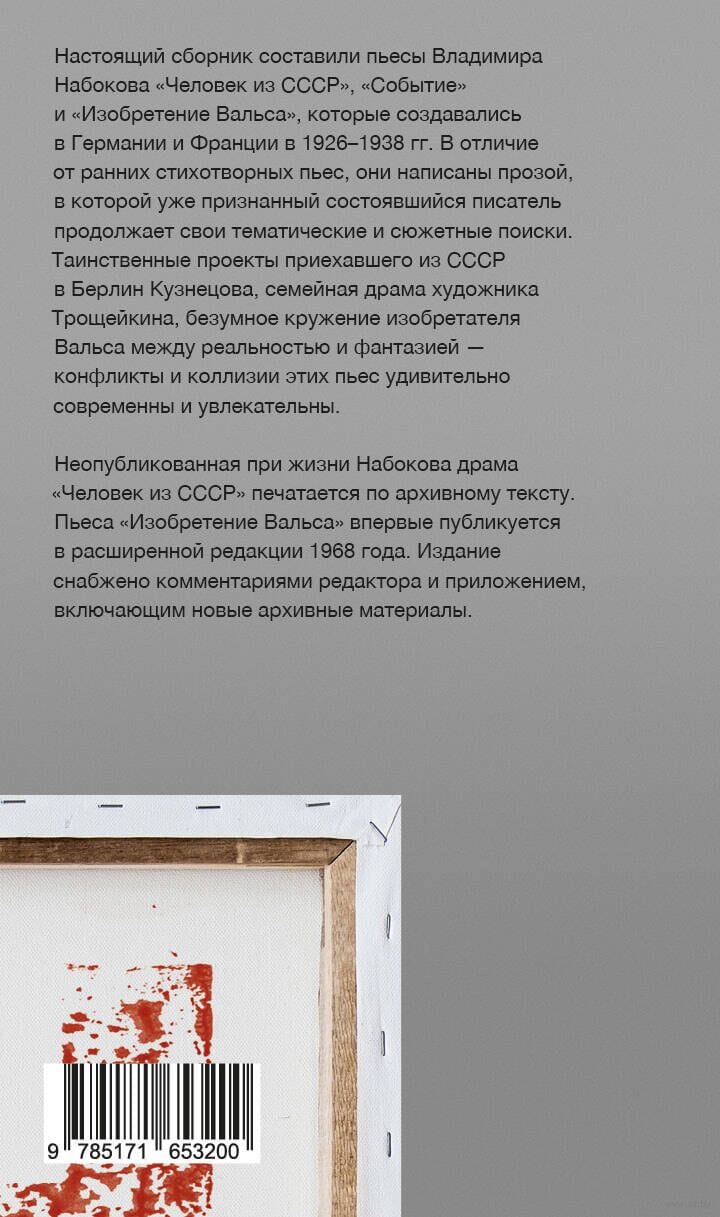 Unpublished during Nabokov's lifetime, the drama The Man from the USSR is printed from an archival text. The play The Invention of Waltz is published for the first time in an expanded 1968 edition. The edition is equipped with the editor's commentary and an appendix including new archival materials.