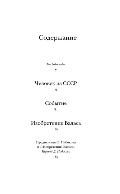 The present collection consists of Vladimir Nabokov's plays The Man from the USSR, The Event and The Invention of Waltz, produced in Germany and France in 1926-1938. Unlike the earlier verse plays, they are written in prose, in which the already recognized writer continues his thematic and narrative quest. The mysterious projects of Kuznetsov, who came from the USSR to Berlin, the family drama of the artist Troshcheikin, the mad whirl of the inventor Waltz between reality and fantasy - the conflicts and collisions of these plays are surprisingly modern and fascinating.