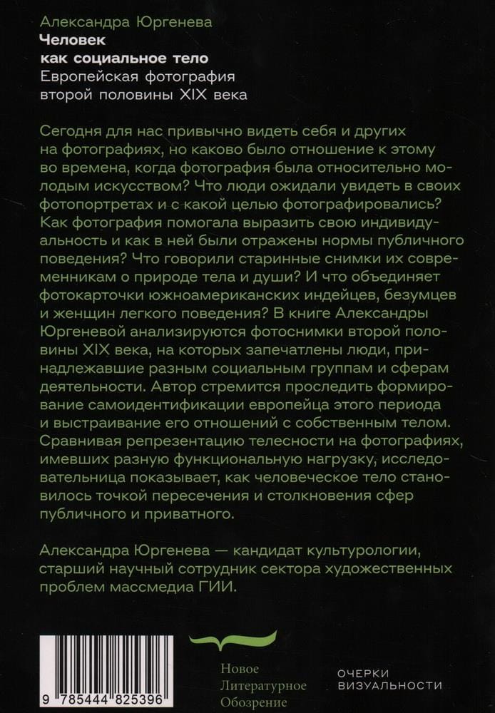 Alexandra Yurgeneva's book analyzes photographs of the second half of the XIX century, which depict people who belonged to different social groups and spheres of activity. The author seeks to trace the formation of self-identification of the European of this period and the construction of his relationship with his own body.