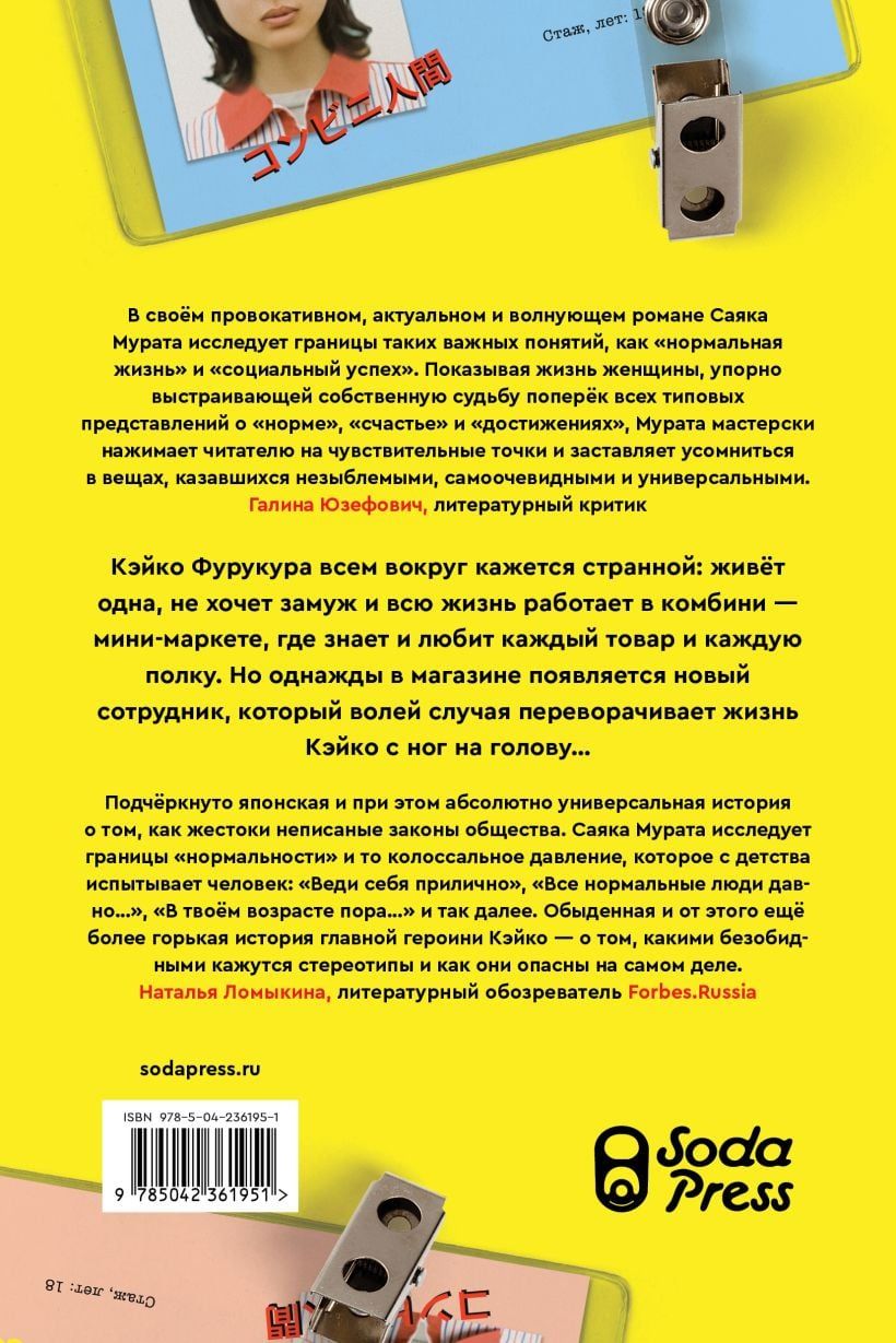 Keiko Furukura has been working part-time at a konbini, a Japanese convenience store, for eighteen years. She's withdrawn and unlike her peers: she lives alone, doesn't date, and has no desire to start a family or find a permanent job. Her entire life revolves around the konbini's routine, where she knows every product and every shelf by heart. However, Keiko seems strange to those around her. She's constantly receiving sideways glances and constantly hears from her friends, "Now you'll find yourself a man..." But one day, a new employee appears at the konbini, who, by chance, turns Keiko's life upside down.